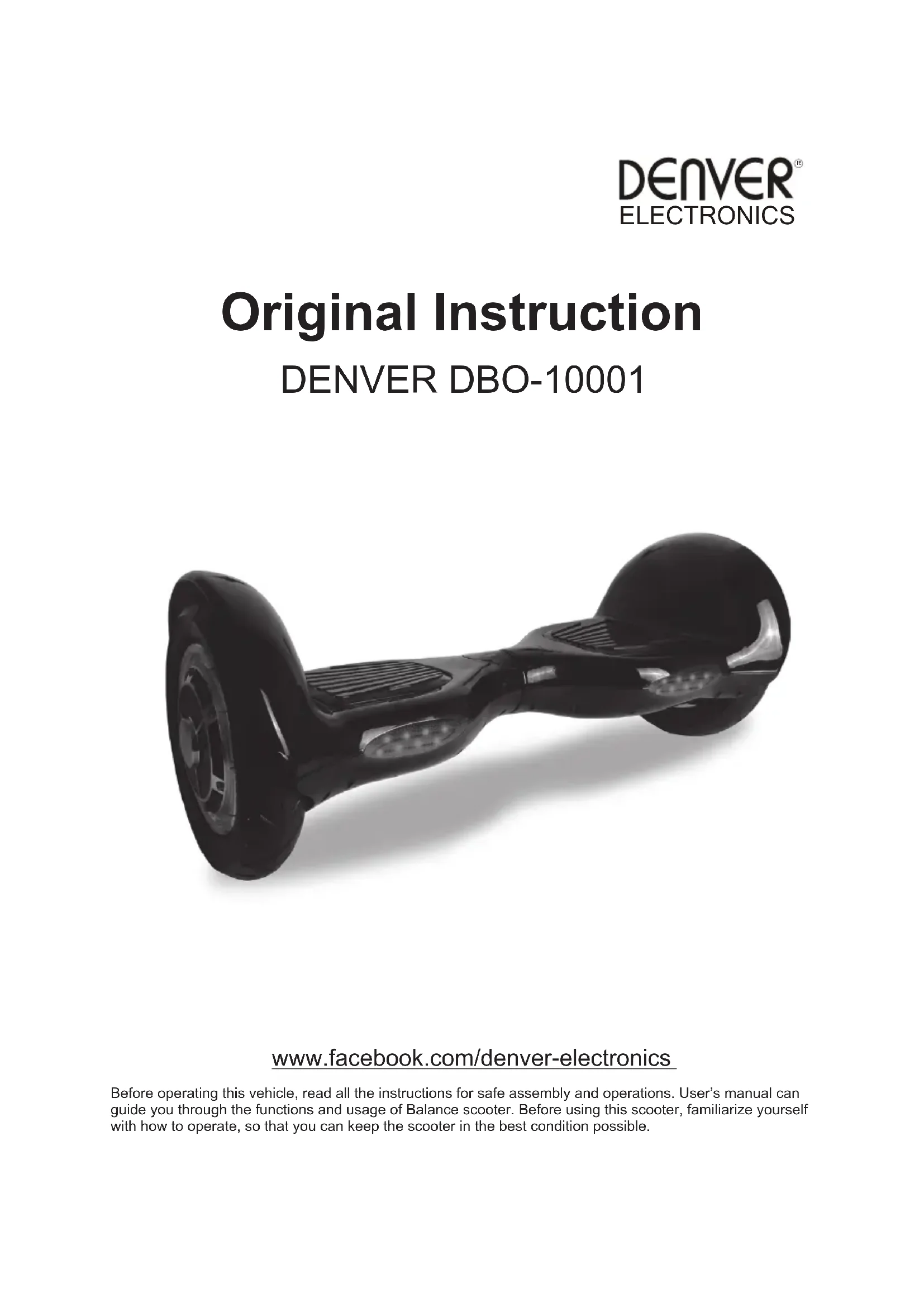 Stavneagervej 22 DK-8250 Egå Danmark NOR 8Original Instruction DENVER DBO-10001 www.facebook.com/denver-electronics Before operating this vehicle, read all the instructions for safe assembly and operations. User’s manual can guide you through the functions and usage of Balance scooter. Before using this scooter, familiarize yourself with how to operate, so that you can keep the scooter in the best condition possible.