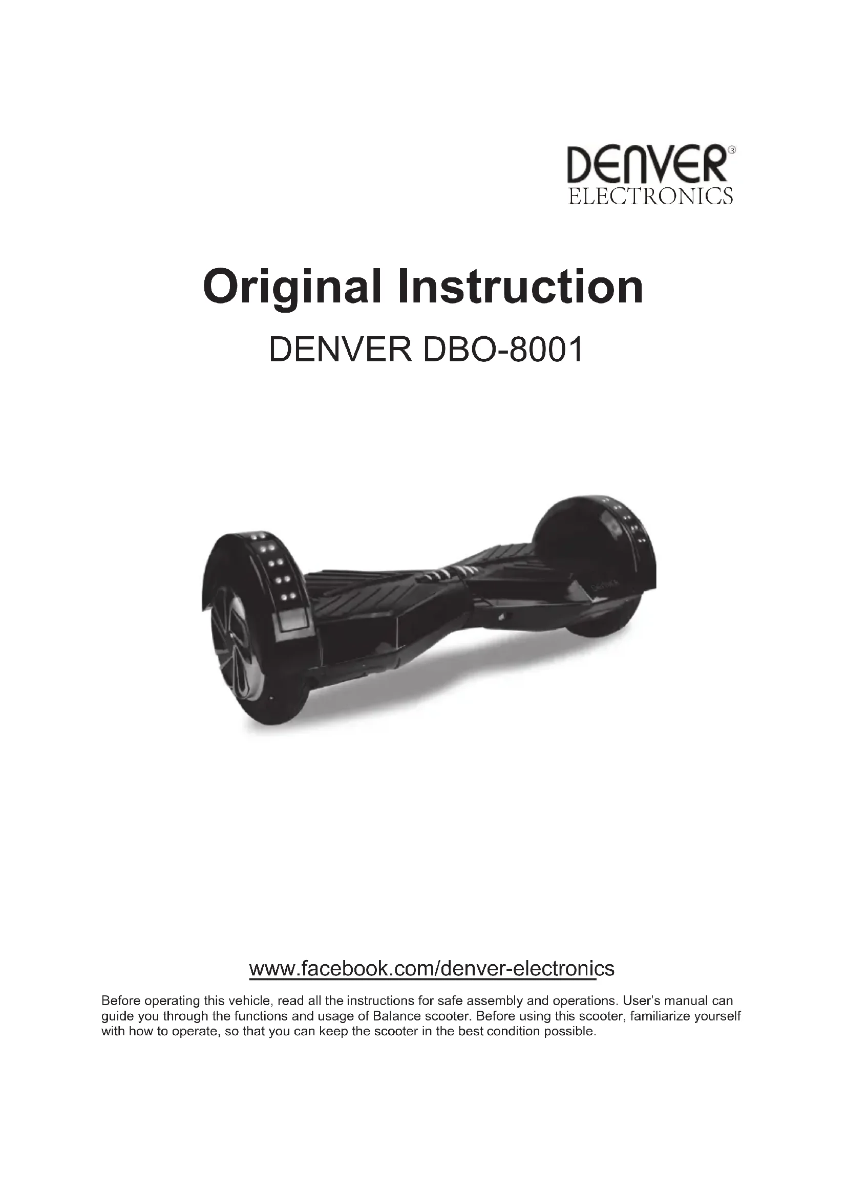 Stavneagervej 22 DK-8250 Egå Danmark www.facebook.com/denverelectronics NOR 8Original Instruction DENVER DBO-8001 www.facebook.com/denver-electronics Before operating this vehicle, read all the instructions for safe assembly and operations. User’s manual can guide you through the functions and usage of Balance scooter. Before using this scooter, familiarize yourself with how to operate, so that you can keep the scooter in the best condition possible.