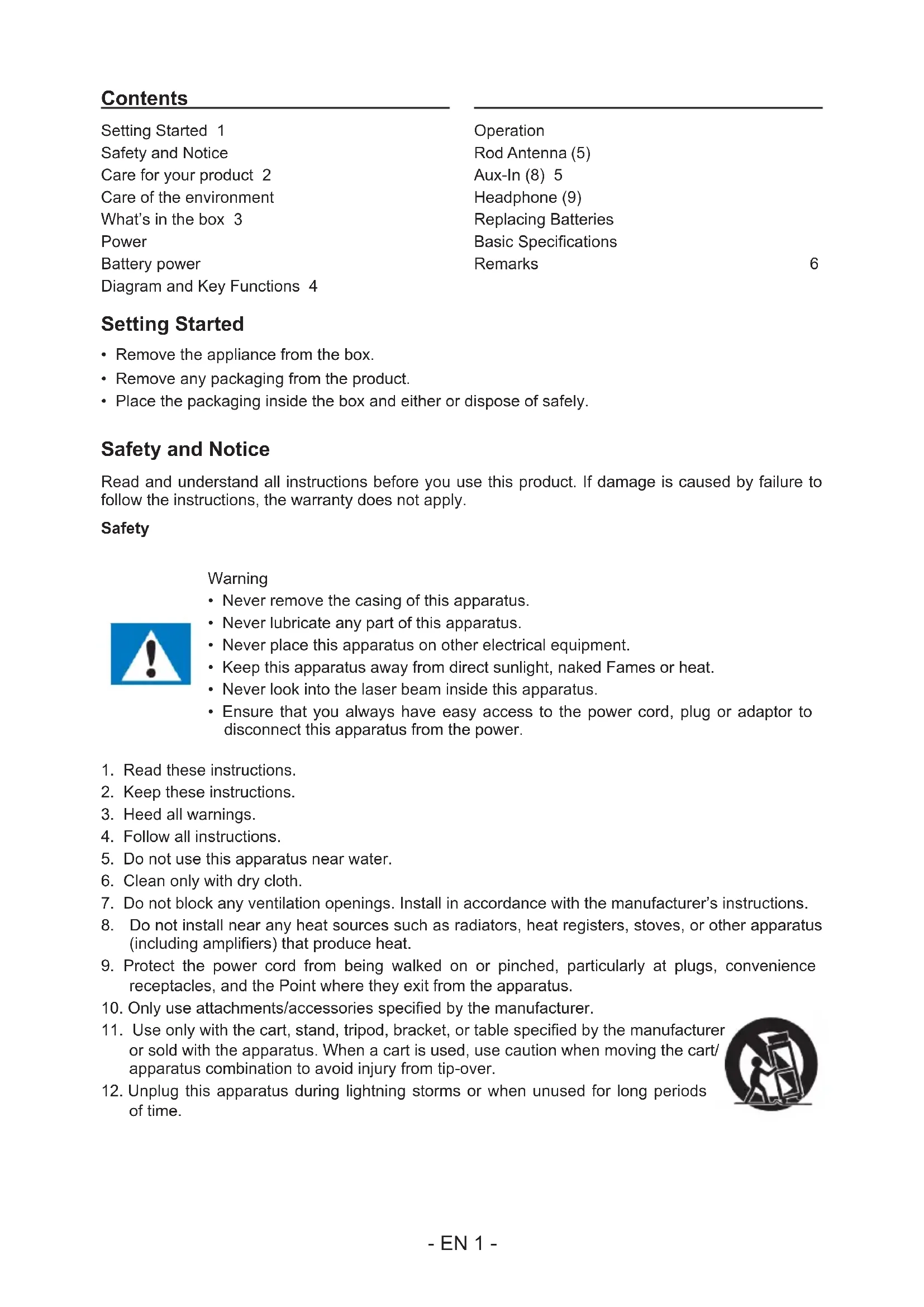 FUTURE REFERENCE EN- EN 1 - Contents Setting Started 1 Safety and Notice Care for your product 2 Care of the environment What’s in the box 3 Power Battery power Diagram and Key Functions 4 Operation Rod Antenna (5) Aux-In (8) 5 Headphone (9) Replacing Batteries Basic Specications Remarks 6 Setting Started