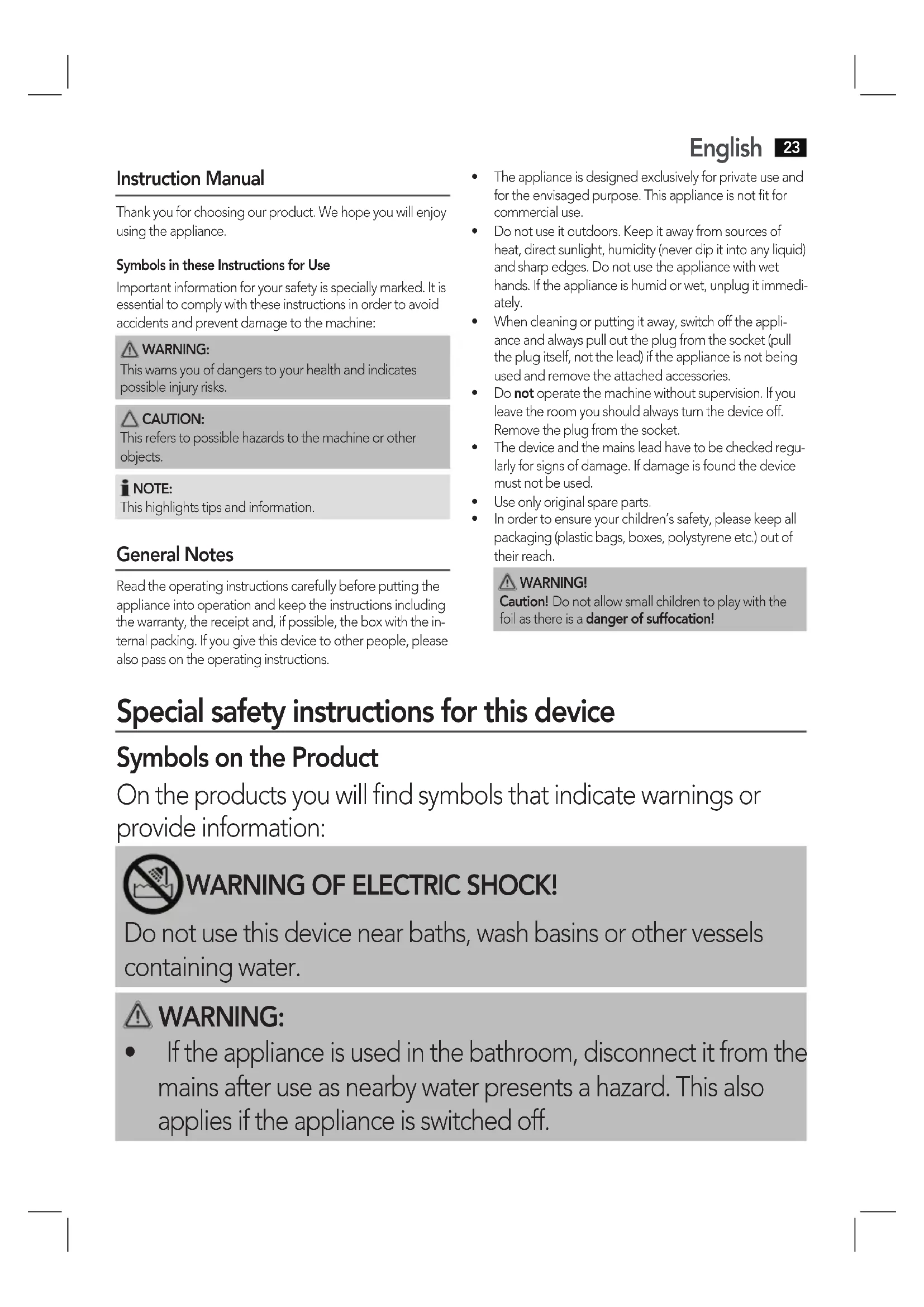 Instruction Manual Thank you for choosing our product. We hope you will enjoy using the appliance.Symbols in these Instructions for UseImportant information for your safety is specially marked. It is essential to comply with these instructions in order to avoid accidents and prevent damage to the machine: WARNING: This warns you of dangers to your health and indicates possible injury risks. CAUTION: This refers to possible hazards to the machine or other objects. NOTE: This highlights tips and information. General Notes Read the operating instructions carefully before putting the appliance into operation and keep the instructions including the warranty, the receipt and, if possible, the box with the in-ternal packing. If you give this device to other people, please also pass on the operating instructions.• Theapplianceisdesignedexclusivelyforprivateuseandfor the envisaged purpose. This appliance is not fit for commercial use. • Donotuseitoutdoors.Keepitawayfromsourcesofheat, direct sunlight, humidity (never dip it into any liquid) and sharp edges. Do not use the appliance with wet hands. If the appliance is humid or wet, unplug it immedi-ately. • Whencleaningorputtingitaway,switchofftheappli-ance and always pull out the plug from the socket (pull the plug itself, not the lead) if the appliance is not being used and remove the attached accessories.• Donot operate the machine without supervision. If you leave the room you should always turn the device off. Remove the plug from the socket.• Thedeviceandthemainsleadhavetobecheckedregu-larly for signs of damage. If damage is found the device must not be used.• Useonlyoriginalspareparts.• Inordertoensureyourchildren’ssafety,pleasekeepallpackaging (plastic bags, boxes, polystyrene etc.) out of their reach. WARNING! Caution! Do not allow small children to play with the foil as there is a danger of suffocation! Special safety instructions for this device Symbols on the Product Ontheproductsyouwillndsymbolsthatindicatewarningsor provide information: WARNING OF ELECTRIC SHOCK! Do not use this device near baths, wash basins or other vessels containing water.