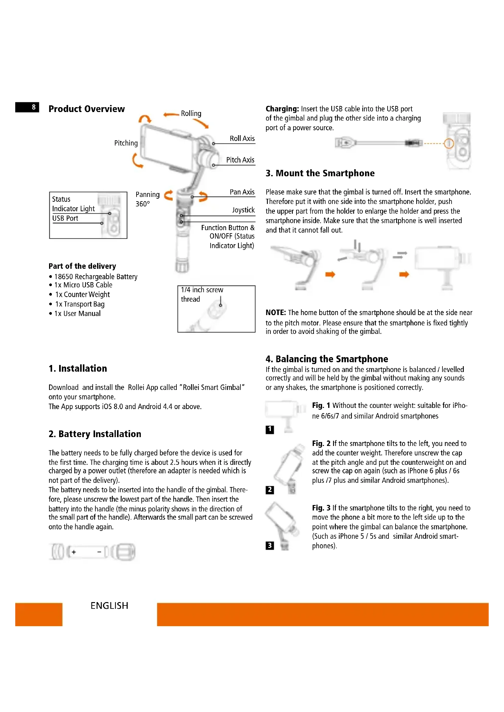 If the gimbal is turned on and the smartphone is balanced / levelled correctly and will be held by the gimbal without making any sounds or any shakes, the smartphone is positioned correctly. Fig. 1 Without the counter weight: suitable for iPho- ne 6/6s/7 and similar Android smartphones Fig. 2 If the smartphone tilts to the left, you need to add the counter weight. Therefore unscrew the cap at the pitch angle and put the counterweight on and screw the cap on again (such as iPhone 6 plus / 6s plus /7 plus and similar Android smartphones). Fig. 3 If the smartphone tilts to the right, you need to move the phone a bit more to the left side up to the point where the gimbal can balance the smartphone. (Such as iPhone 5 / 5s and similar Android smart- phones). Product Overview