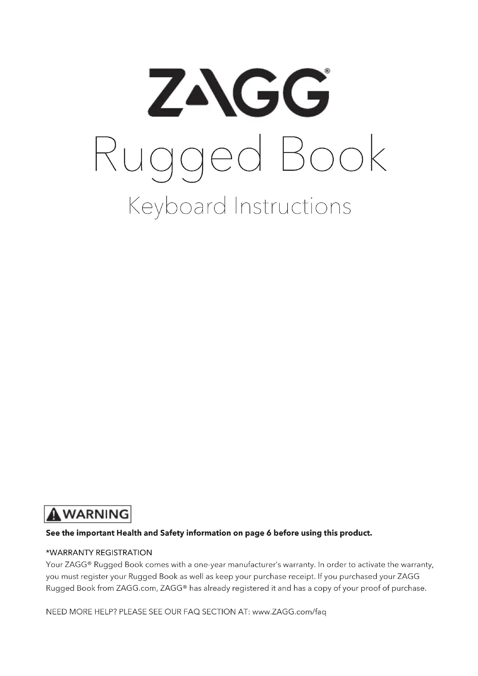 Rugged Book Keyboard Instructions See the important Health and Safety information on page 6 before using this product. *WARRANTY REGISTRATION Your ZAGG® Rugged Book comes with a one-year manufacturer’s warranty. In order to activate the warranty, you must register your Rugged Book as well as keep your purchase receipt. If you purchased your ZAGG Rugged Book from ZAGG.com, ZAGG® has already registered it and has a copy of your proof of purchase. NEED MORE HELP? PLEASE SEE OUR FAQ SECTION AT: www.ZAGG.com/faqINSERTING/REMOVING YOUR TABLET To insert your tablet into the Rugged Book open the Book’s case and remove it from the keyboard (to do this pull the case up and away from the keyboard). Then, line up your tablet with the holes in the case. Make sure the camera hole is aligned properly as well as the opening for your charging cable. When everything is aligned, set the bottom half of your tablet in the cover and apply light pressure to ensure it’s properly settled. Snap the top half of your tablet into the cover. Check all corners to make sure they have seated properly. When your tablet is secure in the case, you can connect it to the keyboard by placing it in the magnetic trough. Powerful magnets will secure it in place, but will also allow you to remove your tablet any time it benefits you. To easily remove your tablet from the case, separate the case from the keyboard, and then gently roll the rubber overmold away from the edges while pressing the tablet from behind. Grasp your tablet’s exposed side and lift/pull away from the Rugged Book.