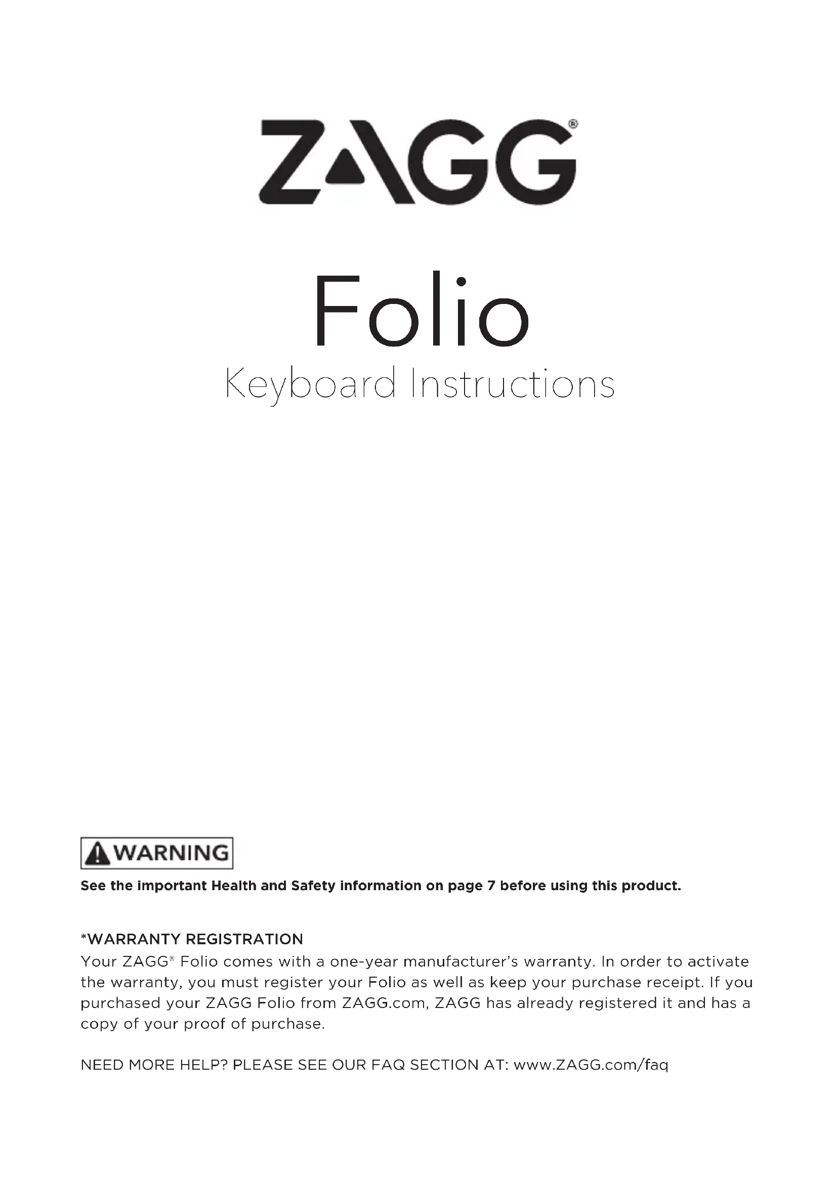 Your ZAGG Folio comes with a one-year manufacturer's warranty. In order to activate the warranty, you must register your Folio as well as keep your purchase receipt. If you purchased your ZAGG Folio from ZAGG.com, ZAGG has already registered it and has a copy of your proof of purchase.