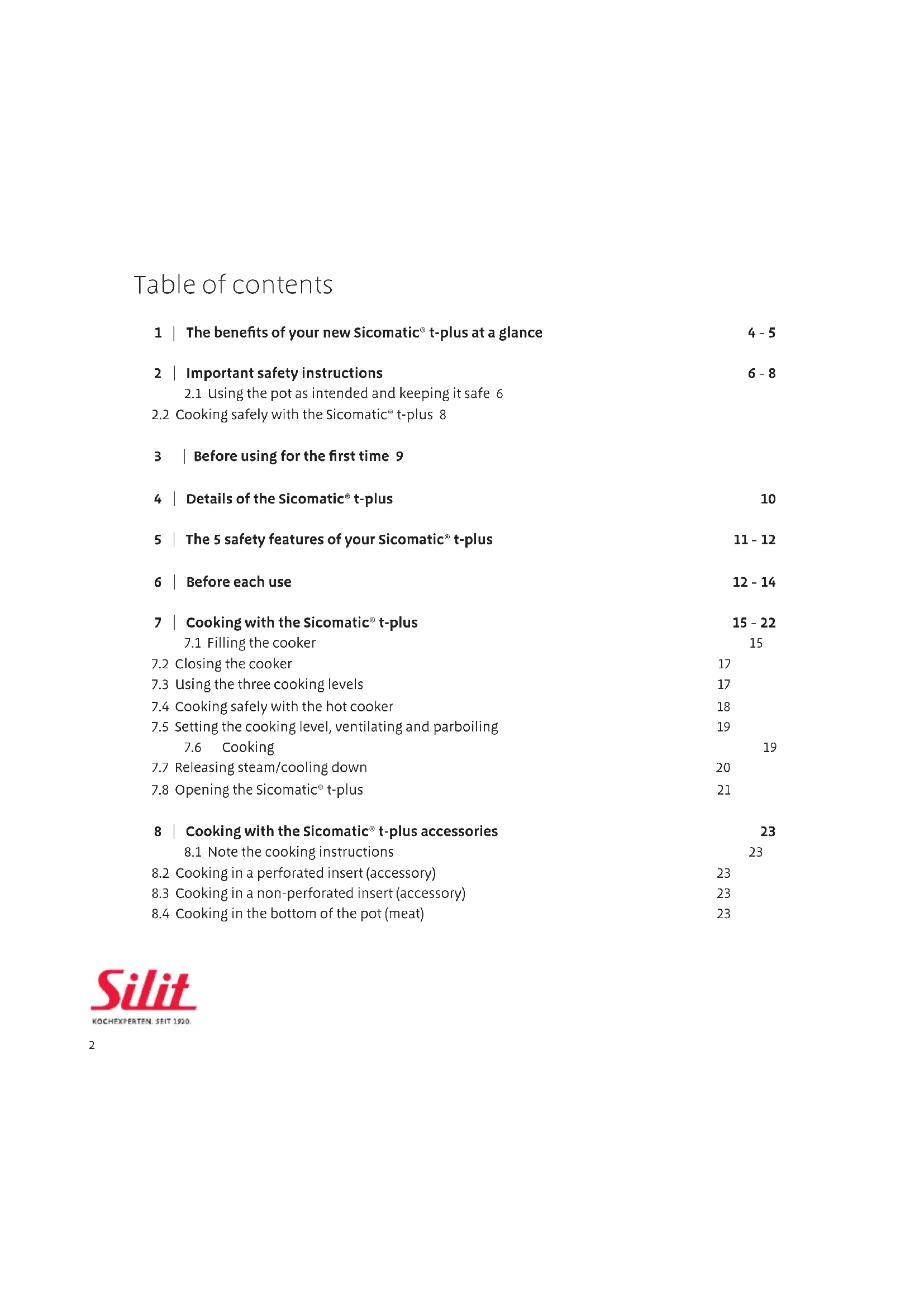 3 | Before using for the rst time 9 4 | Details of the Sicomatic® t-plus 10 5 | The 5 safety features of your Sicomatic® t-plus 11 - 12 6 | Before each use 12 - 14 7 | Cooking with the Sicomatic® t-plus 15 - 22