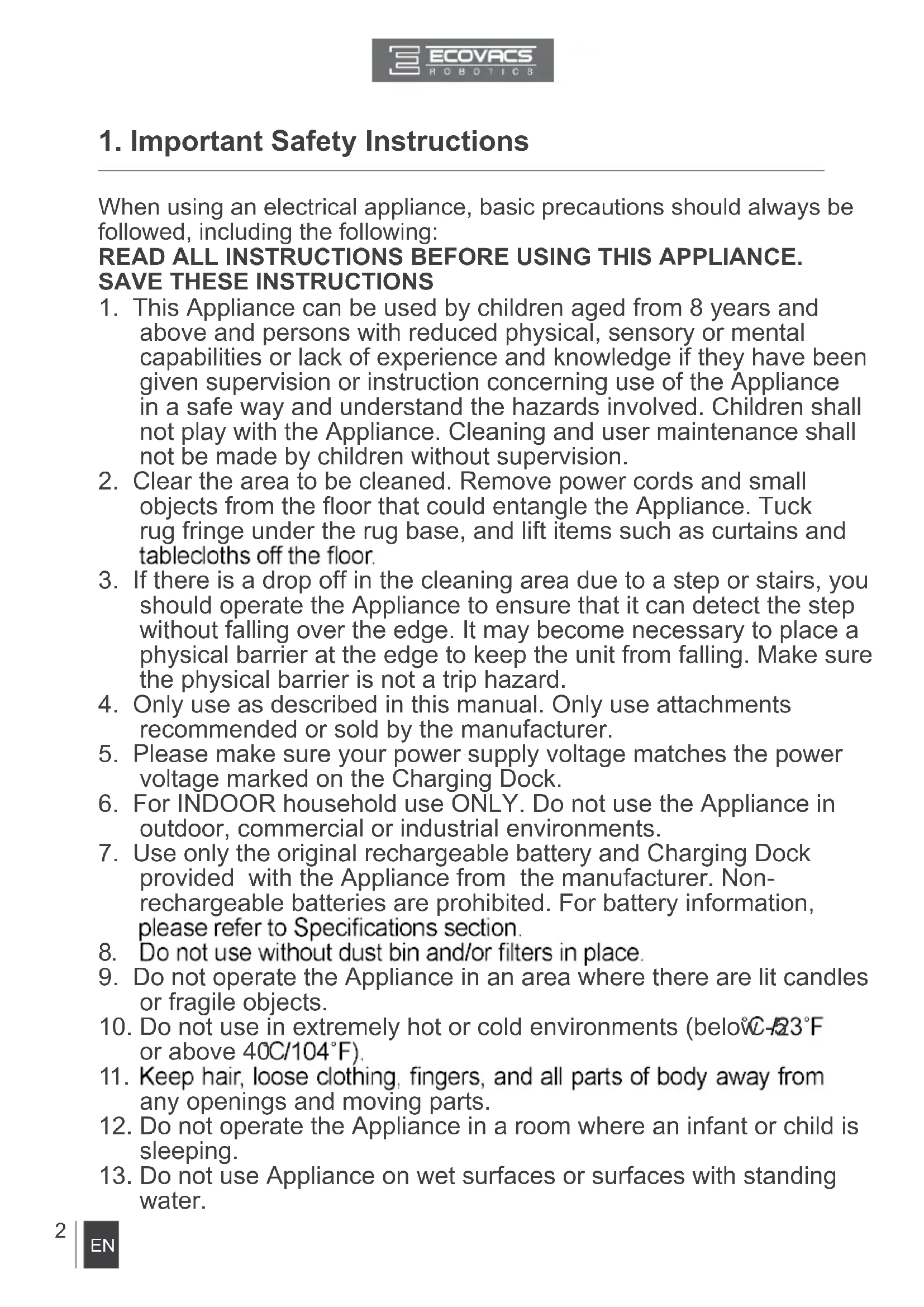 in this Instruction Manual. ECOVACS ROBOTICS cannot be held liable or responsible for any damages or injuries caused by improper use.
