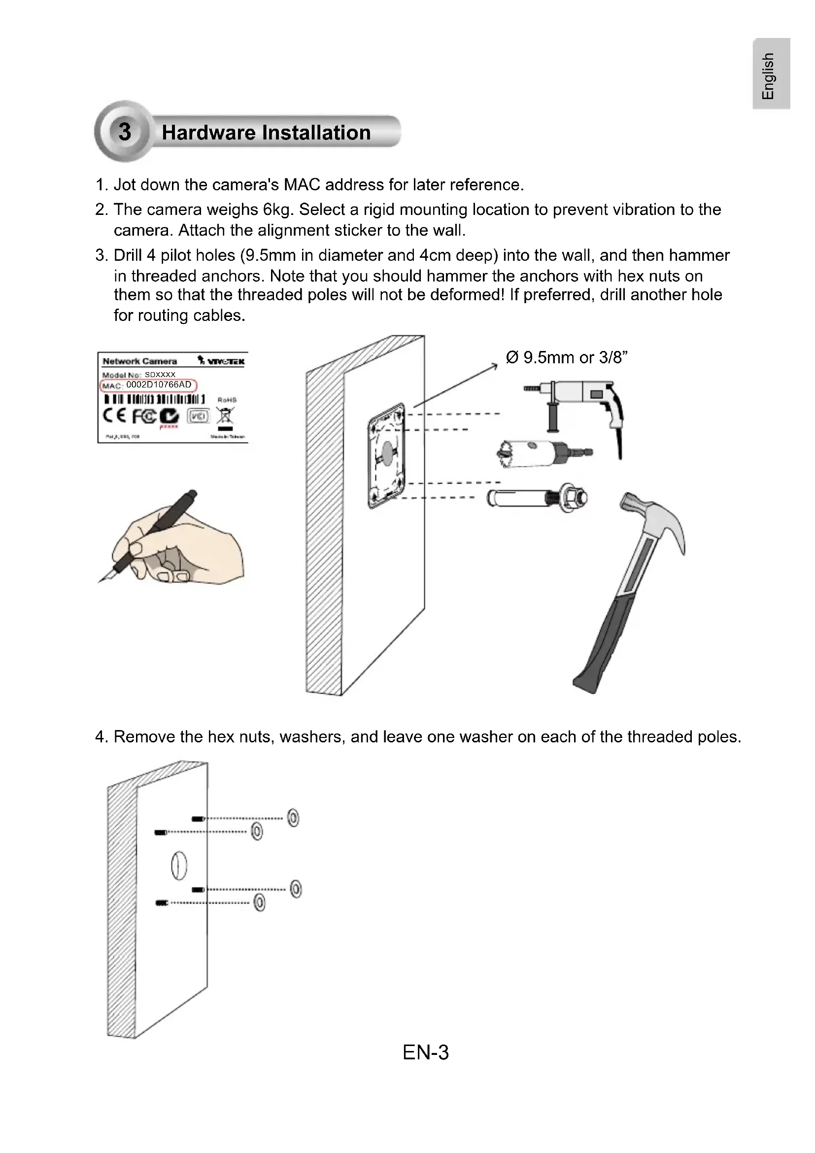 in threaded anchors. Note that you should hammer the anchors with hex nuts on them so that the threaded poles will not be deformed! If preferred, drill another hole for routing cables.
