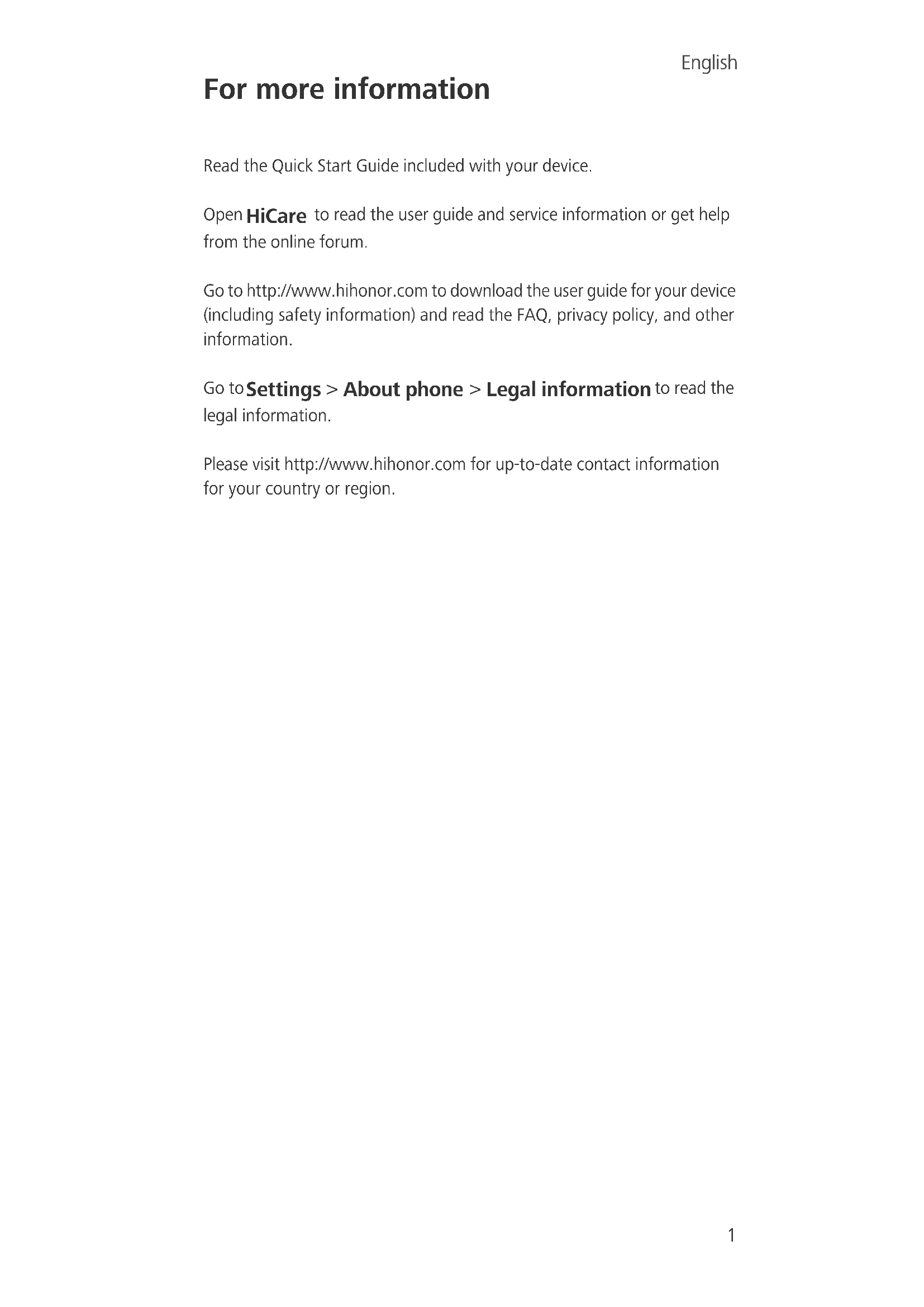 Legal information to read the legal information. Please visit http://www.hihonor.com for up-to-date contact information for your country or region. English2 Your phone at a glance Before you start, let's take a look at your new phone. Press and hold the power button to turn your phone on or off. To forcibly restart your phone, press and hold the power button until your phone vibrates. Light sensor Headset connector Power button Volume button Micro-USB connector Front camera Earpiece Microphone Smart key Dual colour temperature flash Smart Controller Nano-SIM card slot/ MicroSD card slot Fingerprint scanner Front flash Camera Note: Pressing and holding the smart key launches Google Voice Search.3 Getting started Follow the instructions in the following figures to set up your phone. Before you insert or remove the SIM card, power off your phone. When using the SIM ejector pin, exercise caution to avoid injuring yourself or damaging your phone. Keep the pin away from children to prevent them from accidentally swallowing it or injuring themselves.