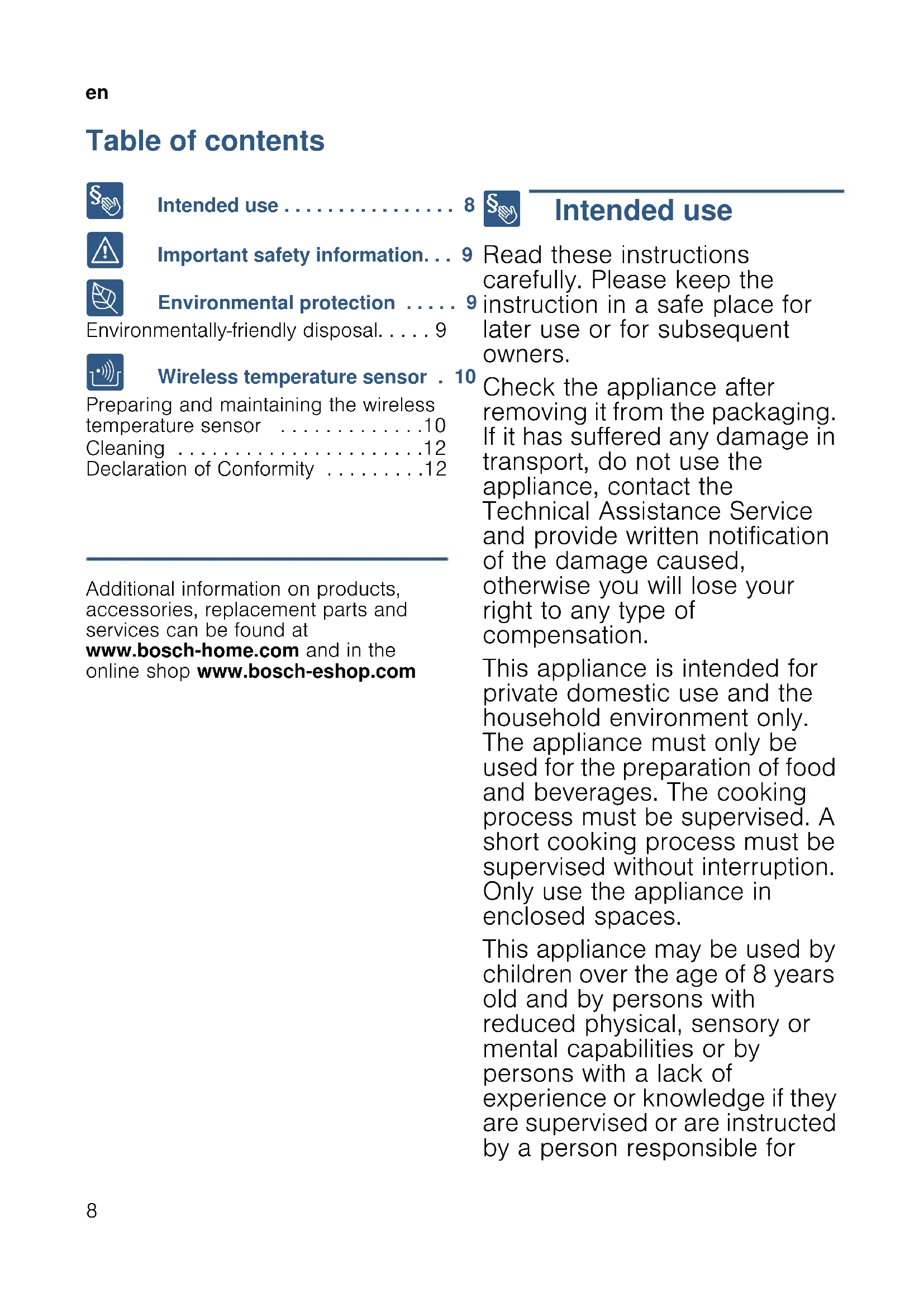 - Declaration of Conformity Produktinfo Additional information on products, accessories, replacement parts and services can be found at www.bosch-home.com and in the online shop www.bosch-eshop.com 8 Intended use Intended use Read these instructions carefully. Please keep the instruction in a safe place for later use or for subsequent owners. Check the appliance after removing it from the packaging. If it has suffered any damage in transport, do not use the appliance, contact the Technical Assistance Service and provide written notification of the damage caused, otherwise you will lose your right to any type of compensation. This appliance is intended for private domestic use and the household environment only. The appliance must only be used for the preparation of food and beverages. The cooking process must be supervised. A short cooking process must be supervised without interruption. Only use the appliance in enclosed spaces. This appliance may be used by children over the age of 8 years old and by persons with reduced physical, sensory or mental capabilities or by persons with a lack of experience or knowledge if they are supervised or are instructed by a person responsible foren p. 12