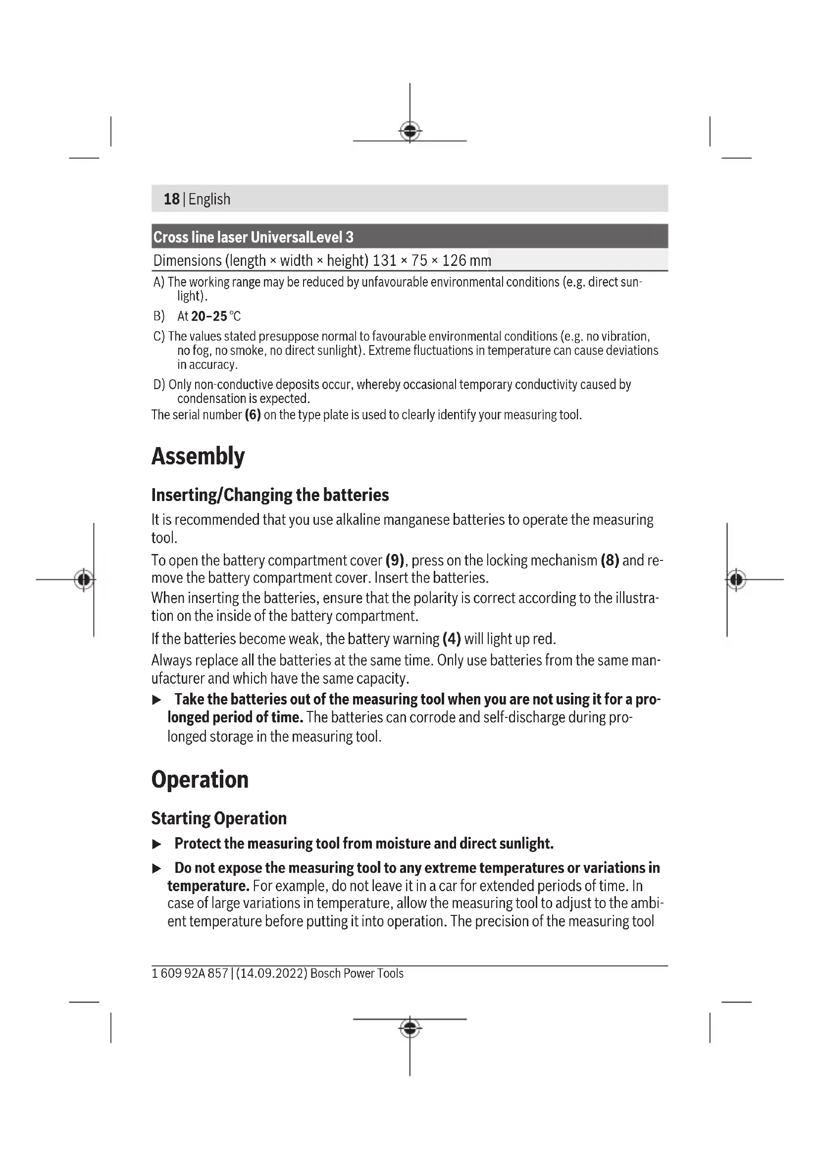 Weight according to EPTA-Procedure 01:2014 0.54kg Bosch Power Tools 1 609 92A 857 | (14.09.2022)18 | English Cross line laser UniversalLevel 3 Dimensions (length × width × height) 131×75×126mm A) The working range may be reduced by unfavourable environmental conditions (e.g. direct sun- light).