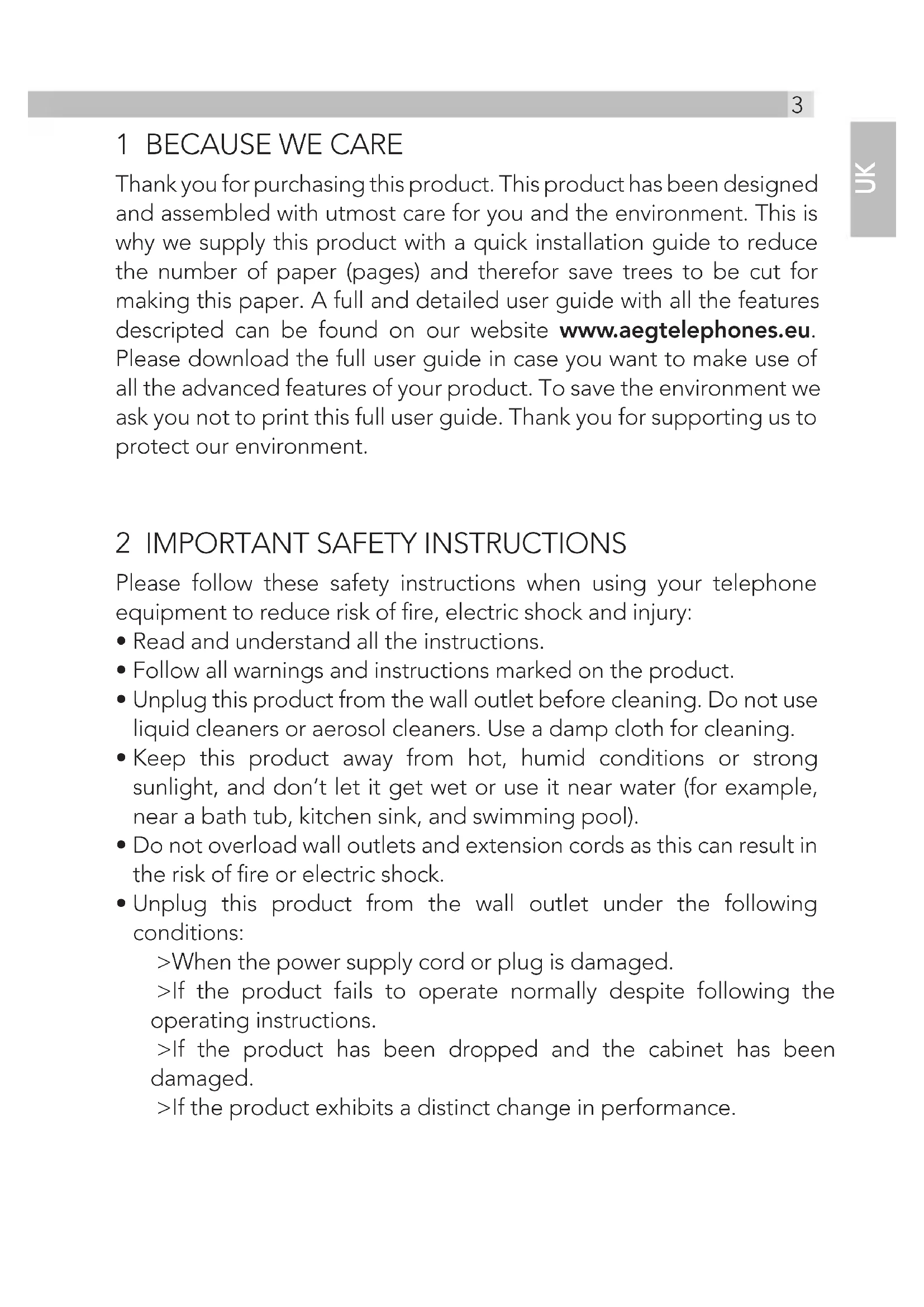 Thank you for purchasing this product. This product has been designed and assembled with utmost care for you and the environment. This is why we supply this product with a quick installation guide to reduce the number of paper (pages) and therefor save trees to be cut for making this paper. A full and detailed user guide with all the features descripted can be found on our website www.aegtelephones.eu. Please download the full user guide in case you want to make use of all the advanced features of your product. To save the environment we ask you not to print this full user guide. Thank you for supporting us to protect our environment.
