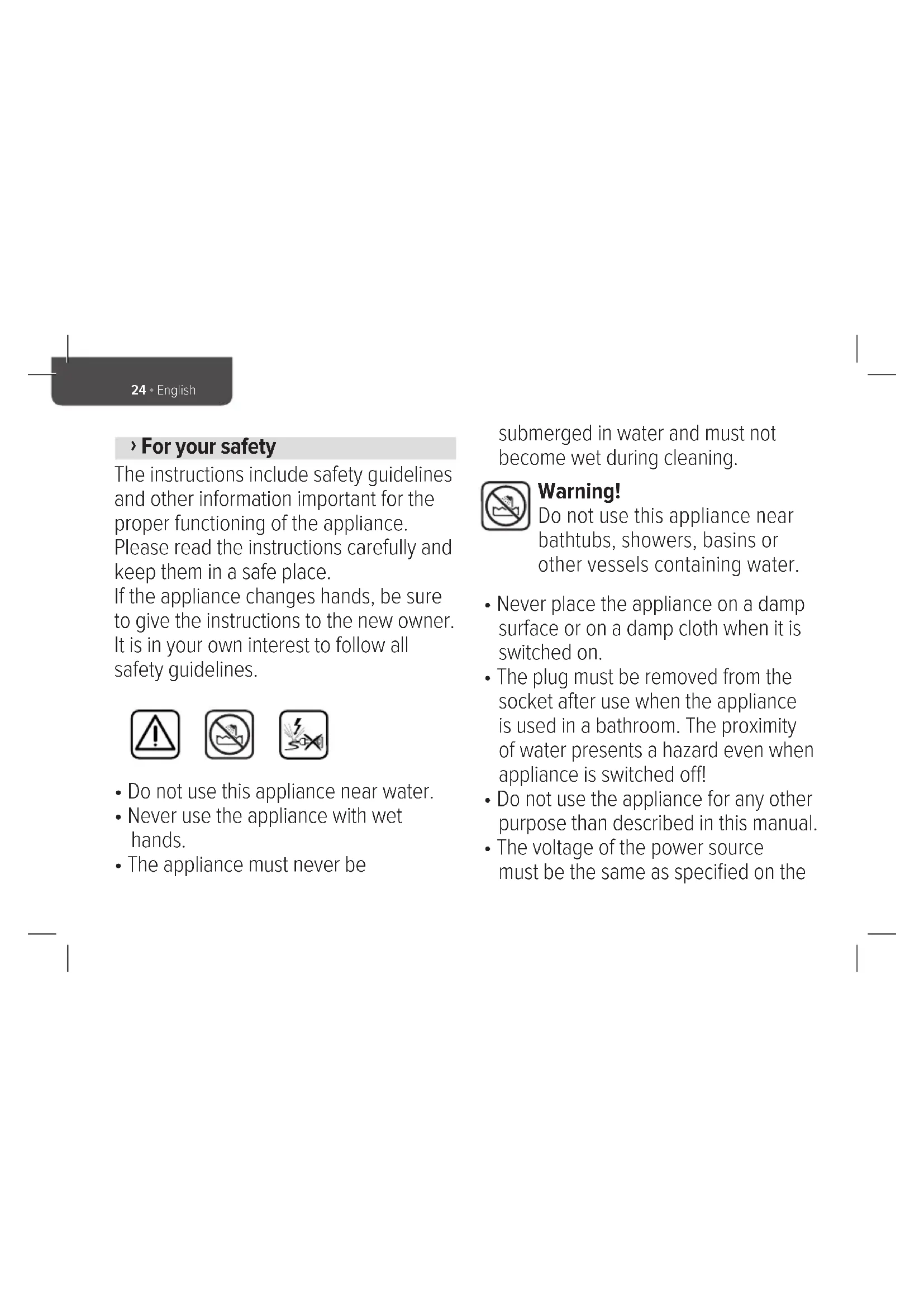 - The plug must be removed from the socket after use when the appliance is used in a bathroom. The proximity of water presents a hazard even when appliance is switched off!