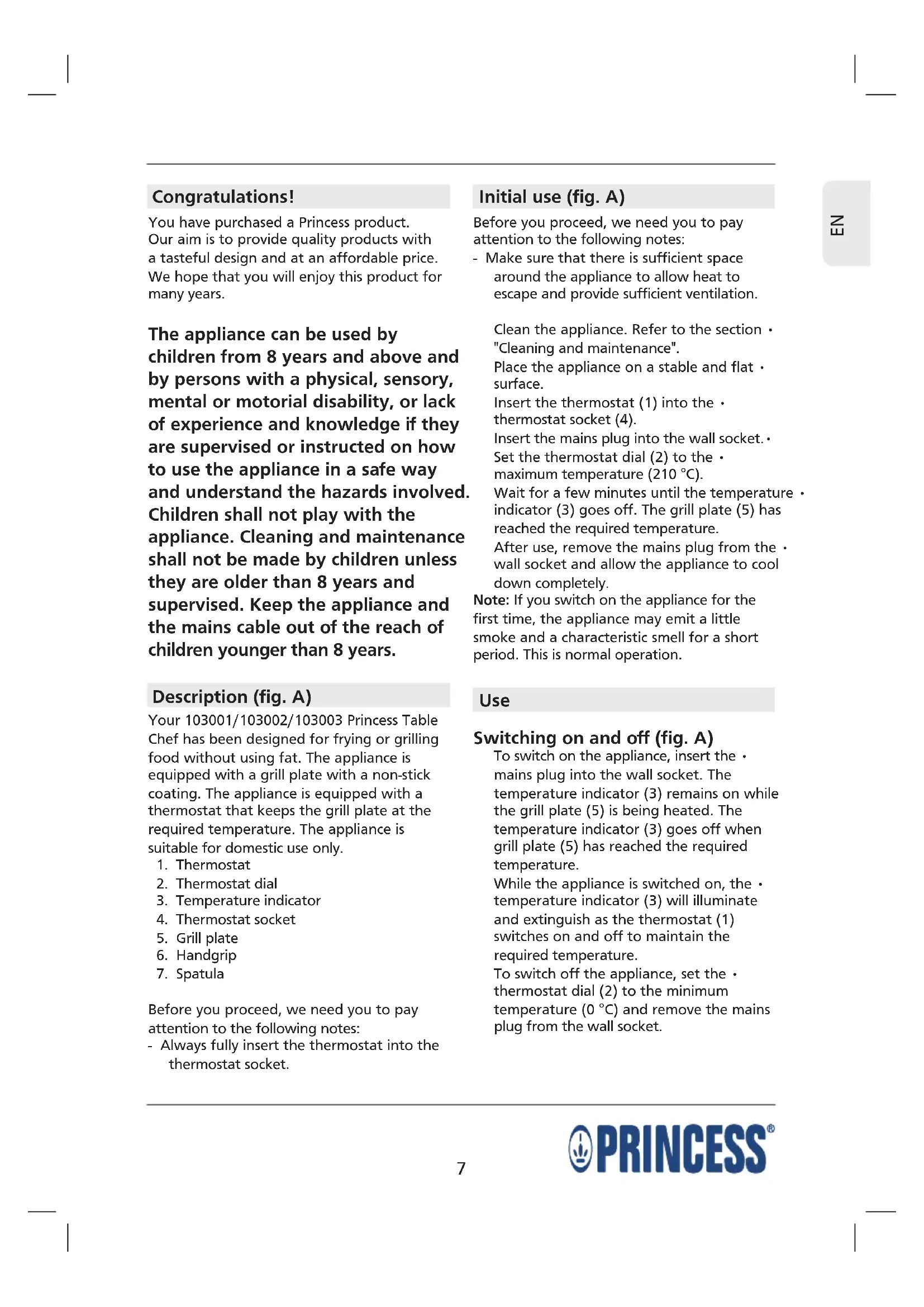 Congratulations! You have purchased a Princess product. Our aim is to provide quality products with a tasteful design and at an affordable price. We hope that you will enjoy this product for many years. The appliance can be used by children from 8 years and above and by persons with a physical, sensory, mental or motorial disability, or lack of experience and knowledge if they are supervised or instructed on how to use the appliance in a safe way and understand the hazards involved. Children shall not play with the appliance. Cleaning and maintenance shall not be made by children unless they are older than 8 years and supervised. Keep the appliance and the mains cable out of the reach of children younger than 8 years. Description (fig. A) Your 103001/103002/103003 Princess Table Chef has been designed for frying or grilling food without using fat. The appliance is equipped with a grill plate with a non-stick coating. The appliance is equipped with a thermostat that keeps the grill plate at the required temperature. The appliance is suitable for domestic use only.