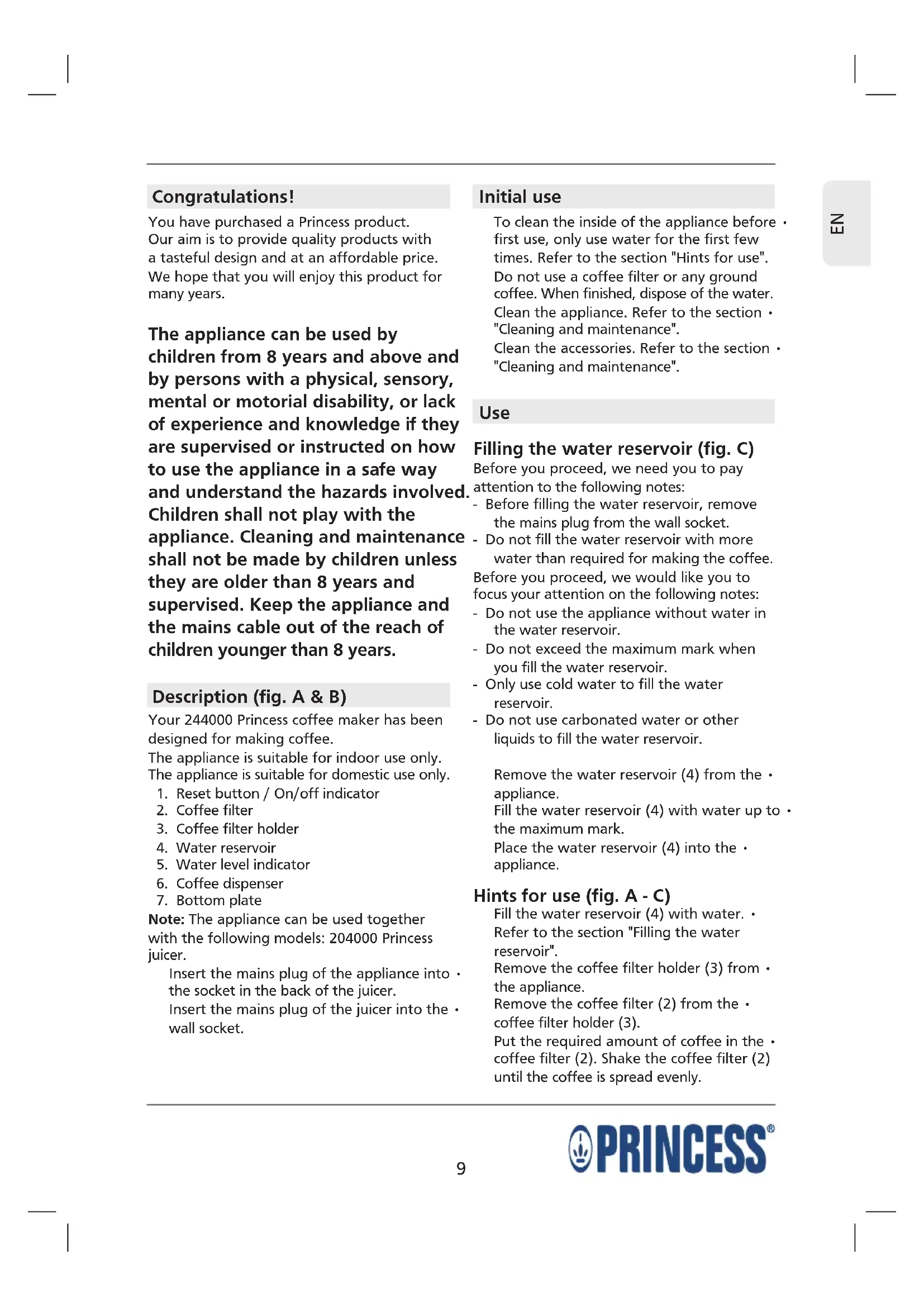 Congratulations! You have purchased a Princess product. Our aim is to provide quality products with a tasteful design and at an affordable price. We hope that you will enjoy this product for many years. The appliance can be used by children from 8 years and above and by persons with a physical, sensory, mental or motorial disability, or lack of experience and knowledge if they are supervised or instructed on how to use the appliance in a safe way and understand the hazards involved. Children shall not play with the appliance. Cleaning and maintenance shall not be made by children unless they are older than 8 years and supervised. Keep the appliance and the mains cable out of the reach of children younger than 8 years. Description (fig. A & B) Your 244000 Princess coffee maker has been designed for making coffee. The appliance is suitable for indoor use only. The appliance is suitable for domestic use only.