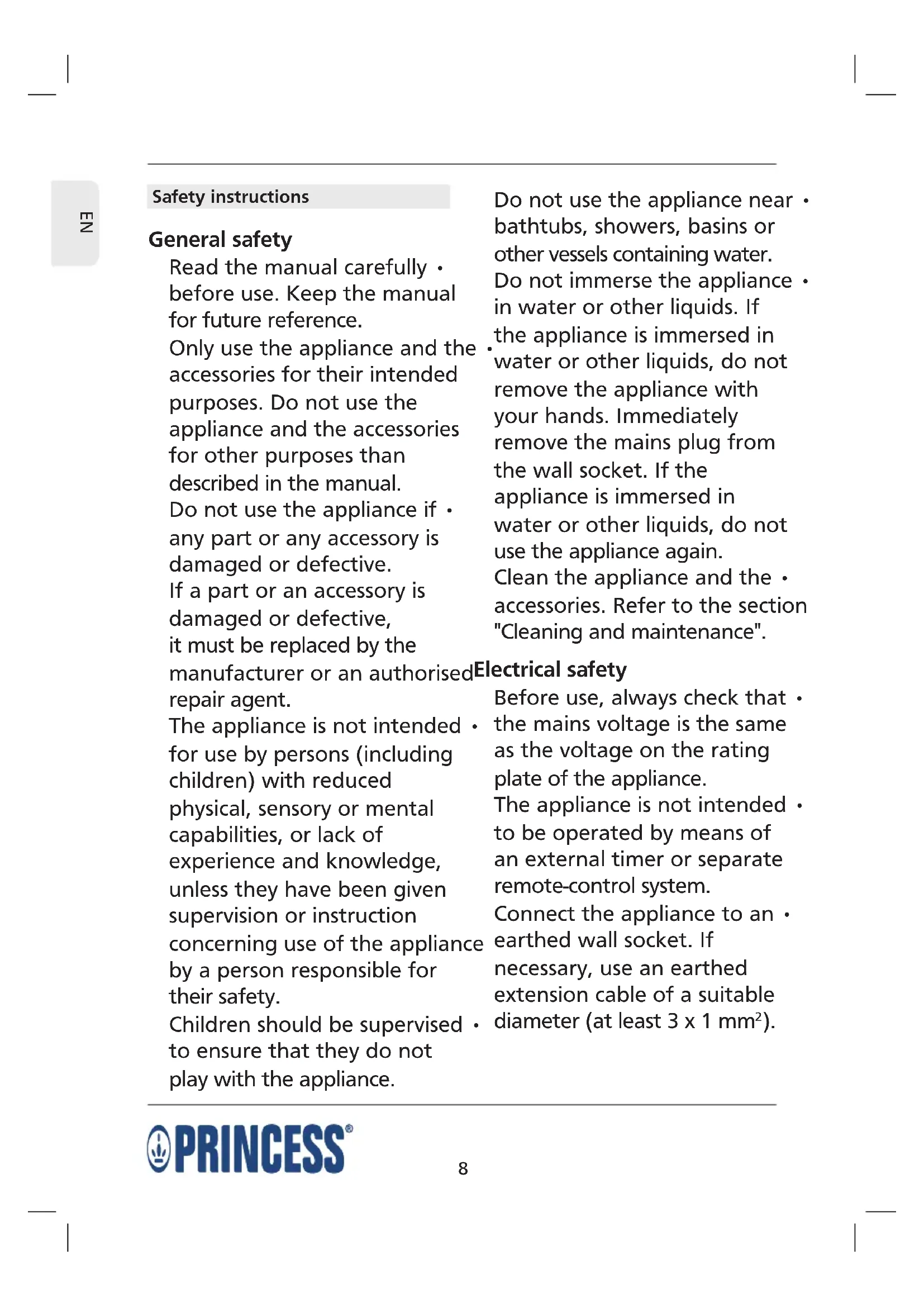 Safety instructions General safety Read the manual carefully • before use. Keep the manual for future reference. Only use the appliance and the • accessories for their intended purposes. Do not use the appliance and the accessories for other purposes than described in the manual. Do not use the appliance if • any part or any accessory is damaged or defective. If a part or an accessory is damaged or defective, it must be replaced by the manufacturer or an authorised repair agent. The appliance is not intended • for use by persons (including children) with reduced physical, sensory or mental capabilities, or lack of experience and knowledge, unless they have been given supervision or instruction concerning use of the appliance by a person responsible for their safety. Children should be supervised • to ensure that they do not play with the appliance. Do not use the appliance near • bathtubs, showers, basins or other vessels containing water. Do not immerse the appliance • in water or other liquids. If the appliance is immersed in water or other liquids, do not remove the appliance with your hands. Immediately remove the mains plug from the wall socket. If the appliance is immersed in water or other liquids, do not use the appliance again. Clean the appliance and the • accessories. Refer to the section "Cleaning and maintenance". Electrical safety Before use, always check that • the mains voltage is the same as the voltage on the rating plate of the appliance. The appliance is not intended • to be operated by means of an external timer or separate remote-control system. Connect the appliance to an • earthed wall socket. If necessary, use an earthed extension cable of a suitable diameter (at least 3 x 1 mm