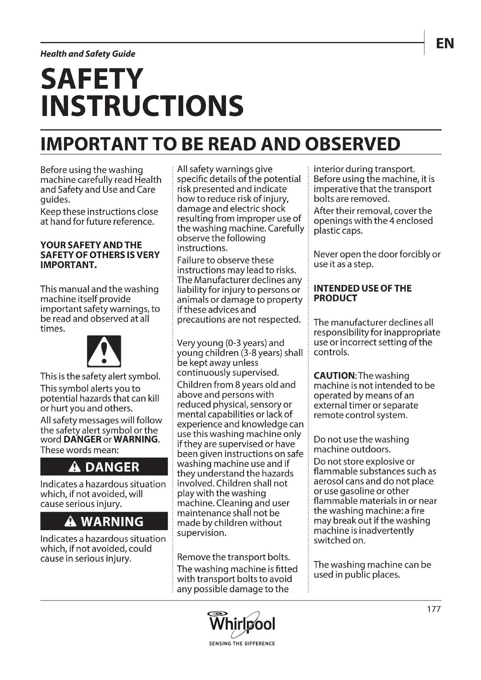 Before using the washing machine carefully read Health and Safety and Use and Care guides.Keep these instructions close at hand for future reference.YOUR SAFETY AND THE SAFETY OF OTHERS IS VERY IMPORTANT.This manual and the washing machine itself provide important safety warnings, to be read and observed at all times.This is the safety alert symbol.This symbol alerts you to potential hazards that can kill or hurt you and others.All safety messages will follow the safety alert symbol or the word DANGER or WARNING. These words mean: DANGER Indicates a hazardous situation which, if not avoided, will cause serious injury. WARNING Indicates a hazardous situation which, if not avoided, could cause in serious injury.All safety warnings give specic details of the potential risk presented and indicate how to reduce risk of injury, damage and electric shock resulting from improper use of the washing machine. Carefully observe the following instructions.Failure to observe these instructions may lead to risks. The Manufacturer declines any liability for injury to persons or animals or damage to property if these advices and precautions are not respected.Very young (0-3 years) and young children (3-8 years) shall be kept away unless continuously supervised.Children from 8 years old and above and persons with reduced physical, sensory or mental capabilities or lack of experience and knowledge can use this washing machine only if they are supervised or have been given instructions on safe washing machine use and if they understand the hazards involved. Children shall not play with the washing machine. Cleaning and user maintenance shall not be made by children without supervision.Remove the transport bolts.The washing machine is tted with transport bolts to avoid any possible damage to the interior during transport. Before using the machine, it is imperative that the transport bolts are removed.After their removal, cover the openings with the 4 enclosed plastic caps.Never open the door forcibly or use it as a step.INTENDED USE OF THE PRODUCTThe manufacturer declines all responsibility for inappropriate use or incorrect setting of the controls.CAUTION: The washing machine is not intended to be operated by means of an external timer or separate remote control system.Do not use the washing machine outdoors.Do not store explosive or ammable substances such as aerosol cans and do not place or use gasoline or other ammable materials in or near the washing machine: a re may break out if the washing machine is inadvertently switched on.The washing machine can be used in public places.Health and Safety Guide178 accordance with the regulations of your local water company. For models dedicated only for cold water: Do not connect to the hot water supply. For models with hot ll: the hot water inlet temperature must not exceed 60°C. Make sure that the ventilation openings in the base of your washing machine (if available on your model) are not obstructed by a carpet or other material. The supply water pressure must be in range 0.1-1MPa. If you want to place a dryer on top of your washing machine, rst contact our After-Sales Service or your specialist dealer to verify if this is possible. This is only admitted if the dryer is xed on the washing machine by using an appropriate stacking kit available through our After- Sales Service or your specialist dealer. ELECTRICAL WARNINGS Make sure the voltage specied on the rating plate corresponds to that of your home. For installation to comply with current safety regulations, an omnipolar switch with minimum contact gap of 3mm is required. Regulation require that the washing machine is earthed. For washing machines with tted plug, if the plug is not This washing machine is exclusively destined to treat machine washable laundry. INSTALLATION Installation and repairs must be carried out by a qualied technician, in compliance with the manufacturer’s instructions and local safety regulations. Do not repair or replace any part of the washing machine unless specically stated in the user manual. Children should not perform installation operations. Keep children away during installation of the washing machine. Keep the packaging materials (plastic bags, polystyrene parts, etc.) out of reach of children, during and after the installation of the washing machine. Use protective gloves to perform all unpacking and installation operations. After unpacking the washing machine, make sure that it has not been damaged during transport. In the event of problems, contact the dealer or your nearest After-sales Service. The washing machine must be handled and installed by two or more persons. Keep children away during installation of the washing machine. The location of the washing machine must ensure permanent visibility and accessibility of the power connection. The washing machine must be disconnected from the power supply before carrying out any installation operation. During installation, make sure the washing machine does not damage the power cable. Only activate the washing machine when the installation procedure has been completed. After installation of the device wait a few hours before starting it, to acclimatize to the environmental conditions of the room. Do not install your washing machine where it may be exposed to extreme conditions, such as: poor ventilation, high temperature or below 5°C or above 35°C. When installing the washing machine make sure that the four feet are stable and resting on the oor, adjusting them as required, and check that the washing machine is perfectly level using a spirit level. In case of wooden or so-called “oating oors” (for instance certain parquet or laminate oors), place the washing machine on a sheet of plywood at least 60x60cm wide/ deep and at least 3 cm thick which is secured to the oor. Use only new hoses to connect the washing machine to the water supply. Used hoses must not be used and should be discarded. Move the washing machine wi