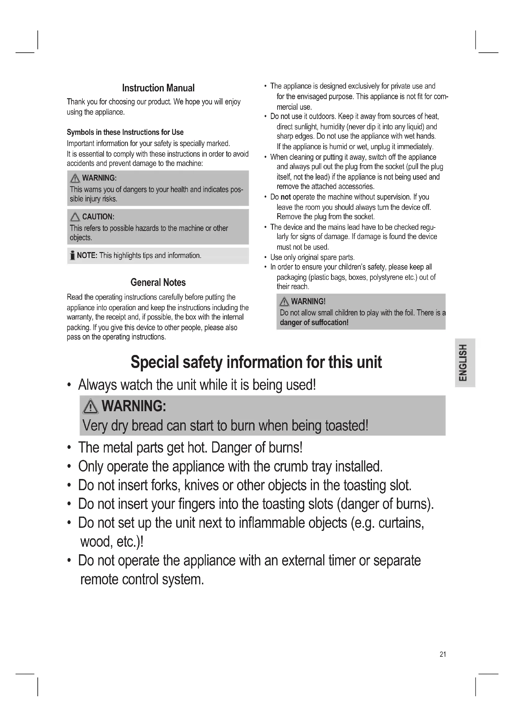 - Do not insert your ngers into the toasting slots (danger of burns).