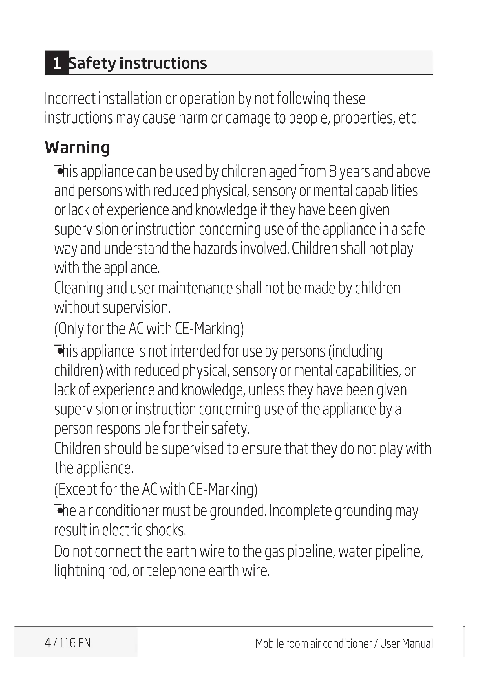 The air conditioner must be grounded. Incomplete grounding may result in electric shocks. Do not connect the earth wire to the gas pipeline, water pipeline, lightning rod, or telephone earth wire. 1 Safety nstructonsMobile room air conditioner / User Manual 5 / 116 EN 1 Safety instructions