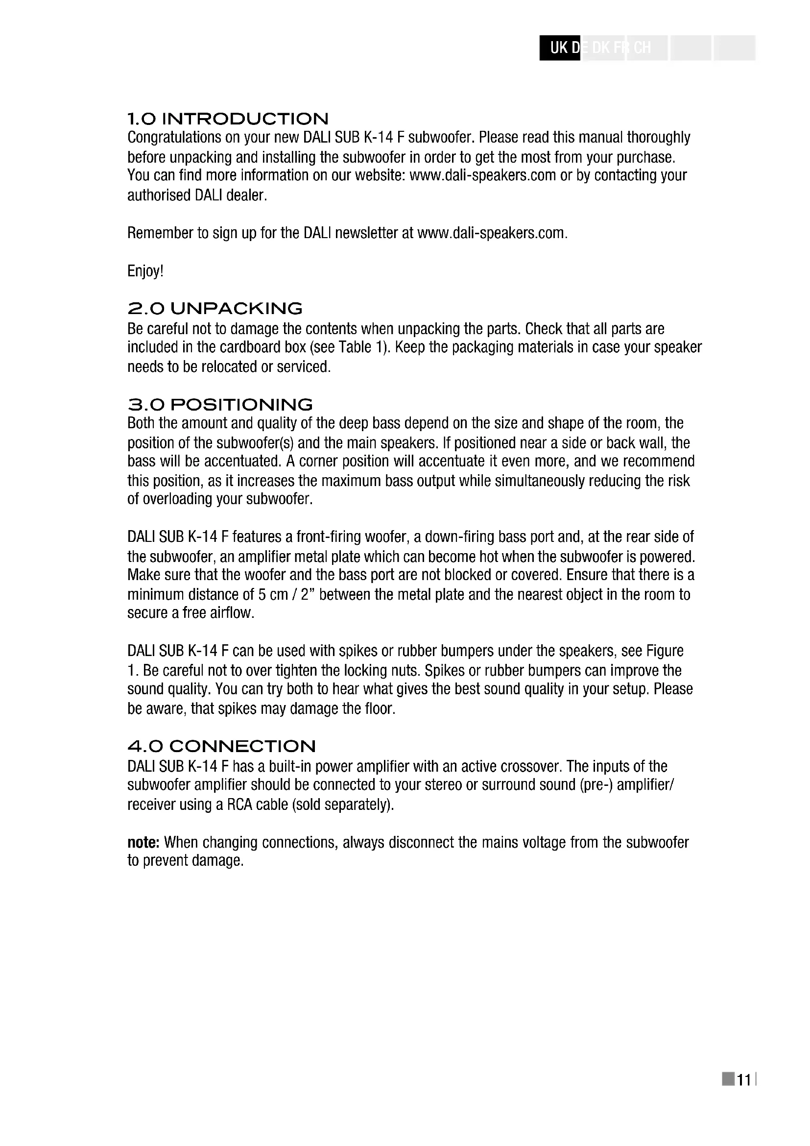 Congratulations on your new DALI SUB K-14 F subwoofer. Please read this manual thoroughly before unpacking and installing the subwoofer in order to get the most from your purchase. You can nd more information on our website: www.dali-speakers.com or by contacting your authorised DALI dealer. Remember to sign up for the DALI newsletter at www.dali-speakers.com. Enjoy!