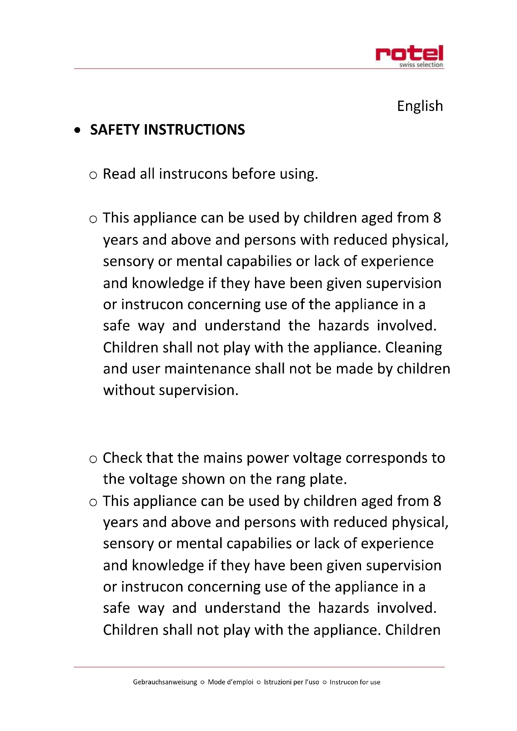 - This appliance can be used by children aged from 8 years and above and persons with reduced physical, sensory or mental capabilities or lack of experience and knowledge if they have been given supervision or instrucon concerning use of the appliance in a safe way and understand the hazards involved. Children shall not play with the appliance. Cleaning and user maintenance shall not be made by children without supervision.