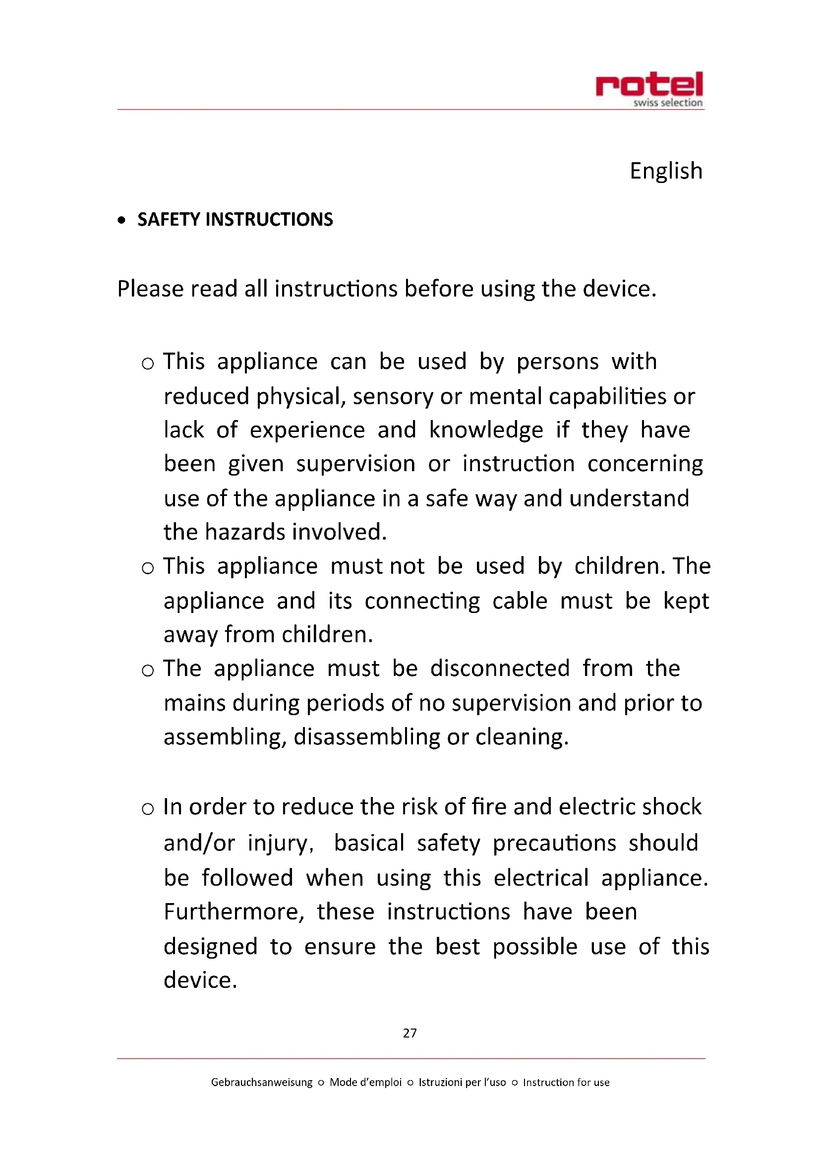 In order to reduce the risk of fire and electric shock and/or injury, basical safety precautions should be followed when using this electrical appliance. Furthermore, these instructions have been designed to ensure the best possible use of this device.