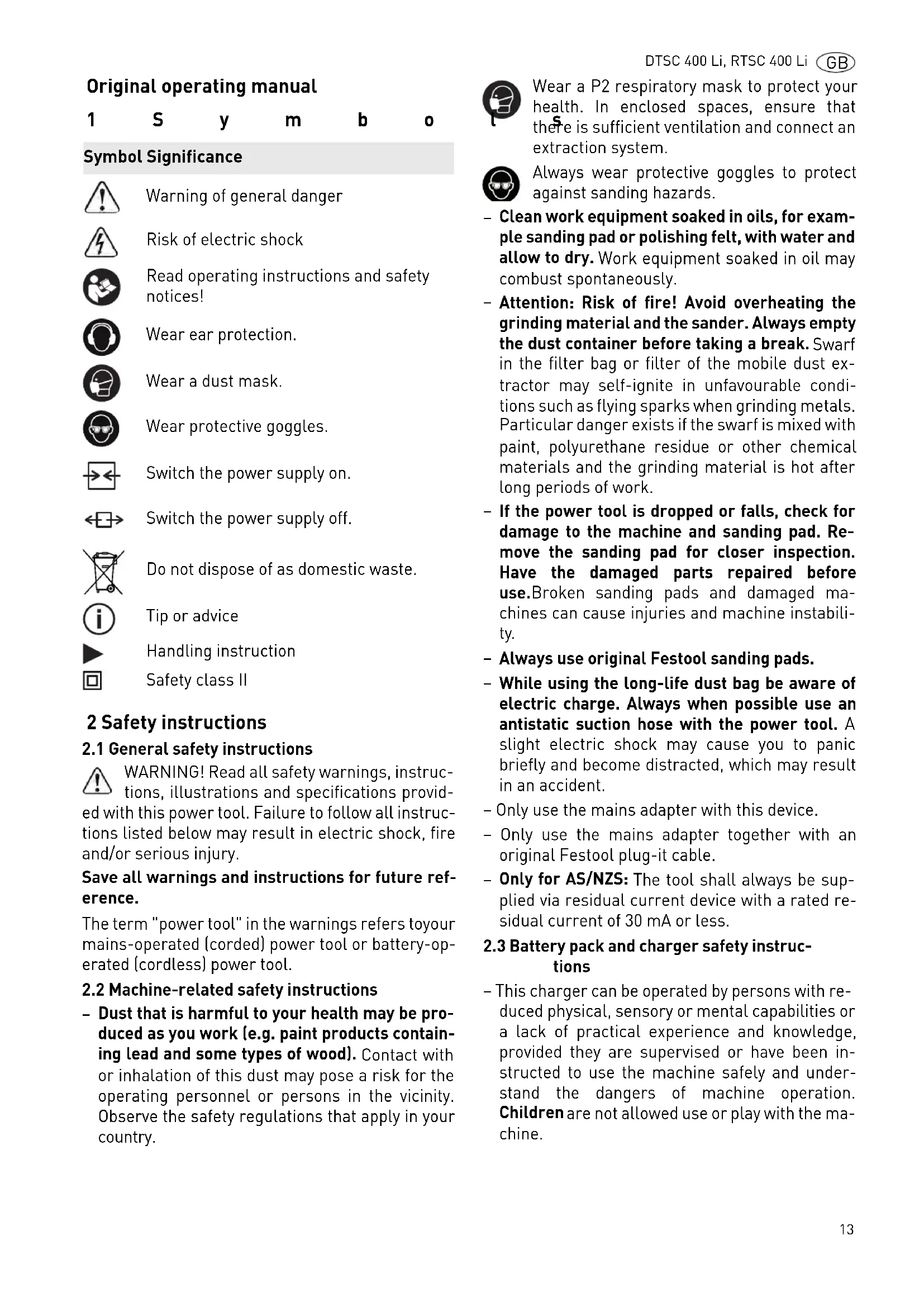 tions – This charger can be operated by persons with re- duced physical, sensory or mental capabilities or a lack of practical experience and knowledge, provided they are supervised or have been in- structed to use the machine safely and under- stand the dangers of machine operation. Children are not allowed use or play with the ma- chine. Symbol Significance Warning of general danger Risk of electric shock Read operating instructions and safety notices! Wear ear protection. Wear a dust mask. Wear protective goggles. Switch the power supply on. Switch the power supply off. Do not dispose of as domestic waste. Tip or advice Handling instruction Safety class II14 DTSC 400 Li, RTSC 400 Li