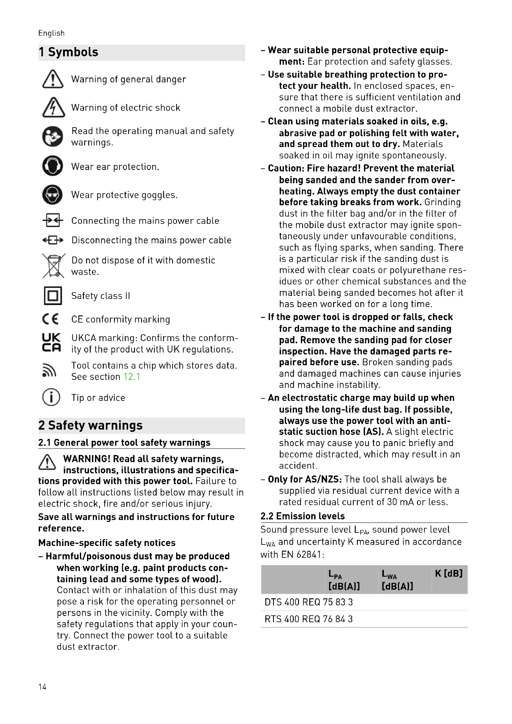 WARNING! Read all safety warnings, instructions, illustrations and specifica tions provided with this power tool. Failure to follow all instructions listed below may result in electric shock, fire and/or serious injury. Save all warnings and instructions for future reference. Machine-specific safety notices – Harmful/poisonous dust may be produced when working (e.g. paint products con taining lead and some types of wood). Contact with or inhalation of this dust may pose a risk for the operating personnel or persons in the vicinity. Comply with the safety regulations that apply in your coun try. Connect the power tool to a suitable dust extractor. – Wear suitable personal protective equip ment: Ear protection and safety glasses. – Use suitable breathing protection to pro tect your health. In enclosed spaces, en sure that there is sufficient ventilation and connect a mobile dust extractor. – Clean using materials soaked in oils, e.g. abrasive pad or polishing felt with water, and spread them out to dry. Materials soaked in oil may ignite spontaneously. – Caution: Fire hazard! Prevent the material being sanded and the sander from over heating. Always empty the dust container before taking breaks from work. Grinding dust in the filter bag and/or in the filter of the mobile dust extractor may ignite spon taneously under unfavourable conditions, such as flying sparks, when sanding. There is a particular risk if the sanding dust is mixed with clear coats or polyurethane res idues or other chemical substances and the material being sanded becomes hot after it has been worked on for a long time. – If the power tool is dropped or falls, check for damage to the machine and sanding pad. Remove the sanding pad for closer inspection. Have the damaged parts re paired before use. Broken sanding pads and damaged machines can cause injuries and machine instability. – An electrostatic charge may build up when using the long-life dust bag. If possible, always use the power tool with an anti- static suction hose (AS). A slight electric shock may cause you to panic briefly and become distracted, which may result in an accident. – Only for AS/NZS: The tool shall always be supplied via residual current device with a rated residual current of 30mA or less.