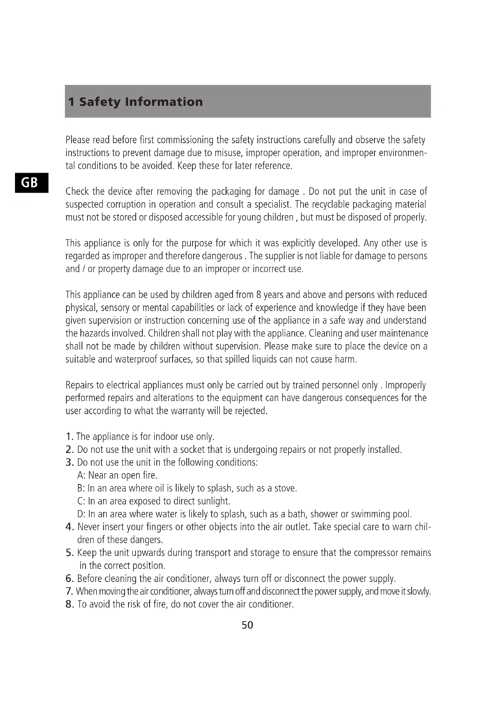 8. To avoid the risk of fire, do not cover the air conditioner.GB