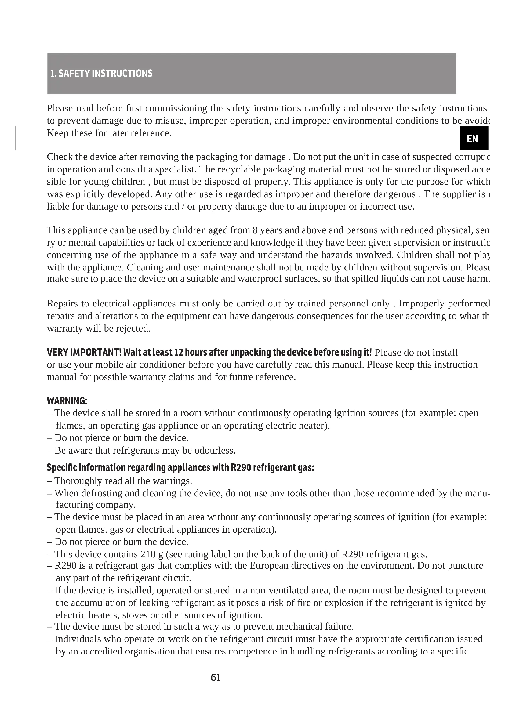– The device shall be stored in a room without continuously operating ignition sources (for example: open flames, an operating gas appliance or an operating electric heater). – Do not pierce or burn the device. – Be aware that refrigerants may be odourless. Specific information regarding appliances with R290 refrigerant gas: – Thoroughly read all the warnings. – When defrosting and cleaning the device, do not use any tools other than those recommended by the manu- facturing company. – The device must be placed in an area without any continuously operating sources of ignition (for example: open flames, gas or electrical appliances in operation). – Do not pierce or burn the device. – This device contains 210 g (see rating label on the back of the unit) of R290 refrigerant gas. – R290 is a refrigerant gas that complies with the European directives on the environment. Do not puncture any part of the refrigerant circuit. – If the device is installed, operated or stored in a non-ventilated area, the room must be designed to prevent the accumulation of leaking refrigerant as it poses a risk of fire or explosion if the refrigerant is ignited by electric heaters, stoves or other sources of ignition. – The device must be stored in such a way as to prevent mechanical failure. – Individuals who operate or work on the refrigerant circuit must have the appropriate certification issued by an accredited organisation that ensures competence in handling refrigerants according to a specific