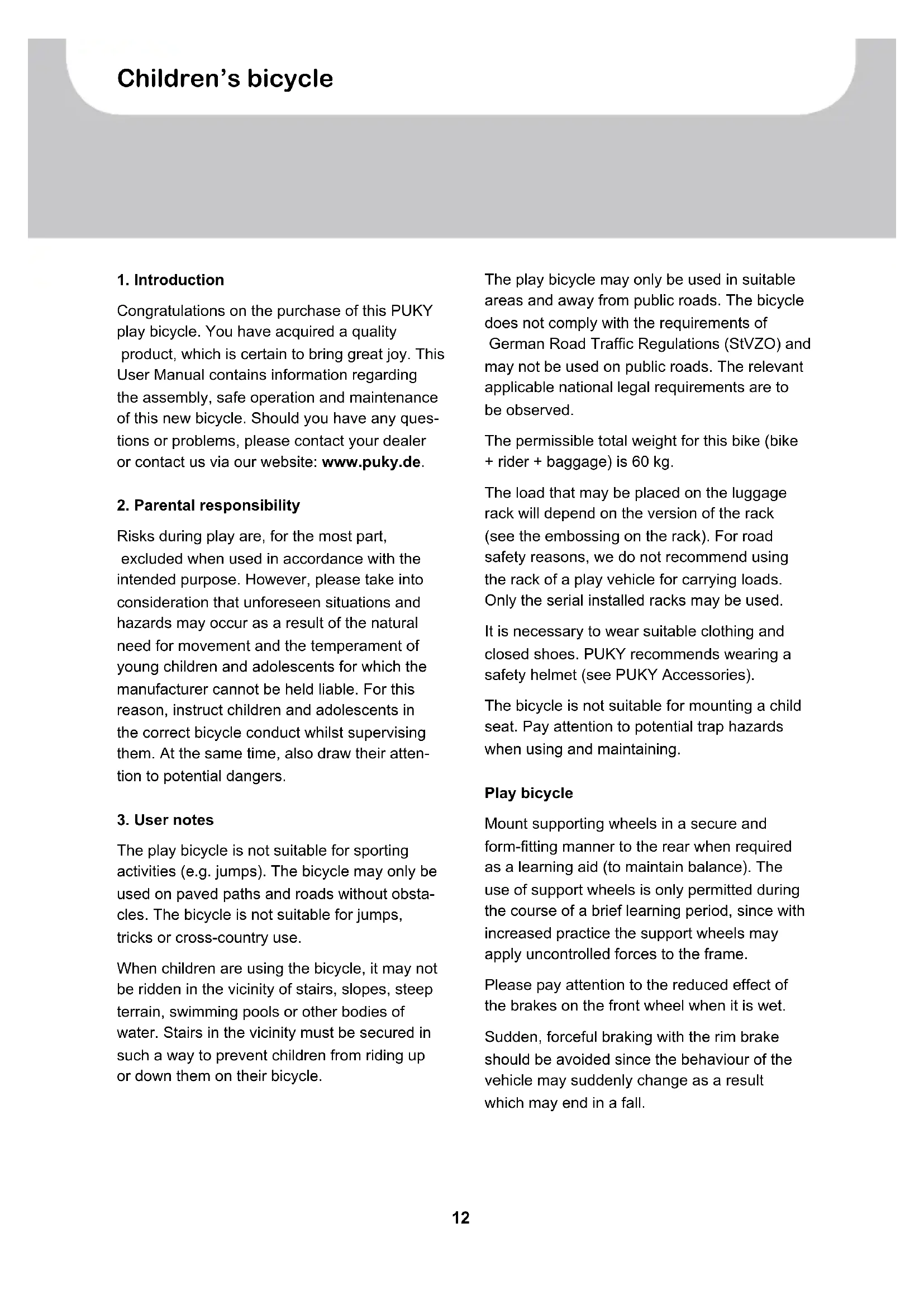 Congratulations on the purchase of this PUKY play bicycle. You have acquired a quality product, which is certain to bring great joy. This User Manual contains information regarding the assembly, safe operation and maintenance of this new bicycle. Should you have any questions or problems, please contact your dealer or contact us via our website: www.puky.de.