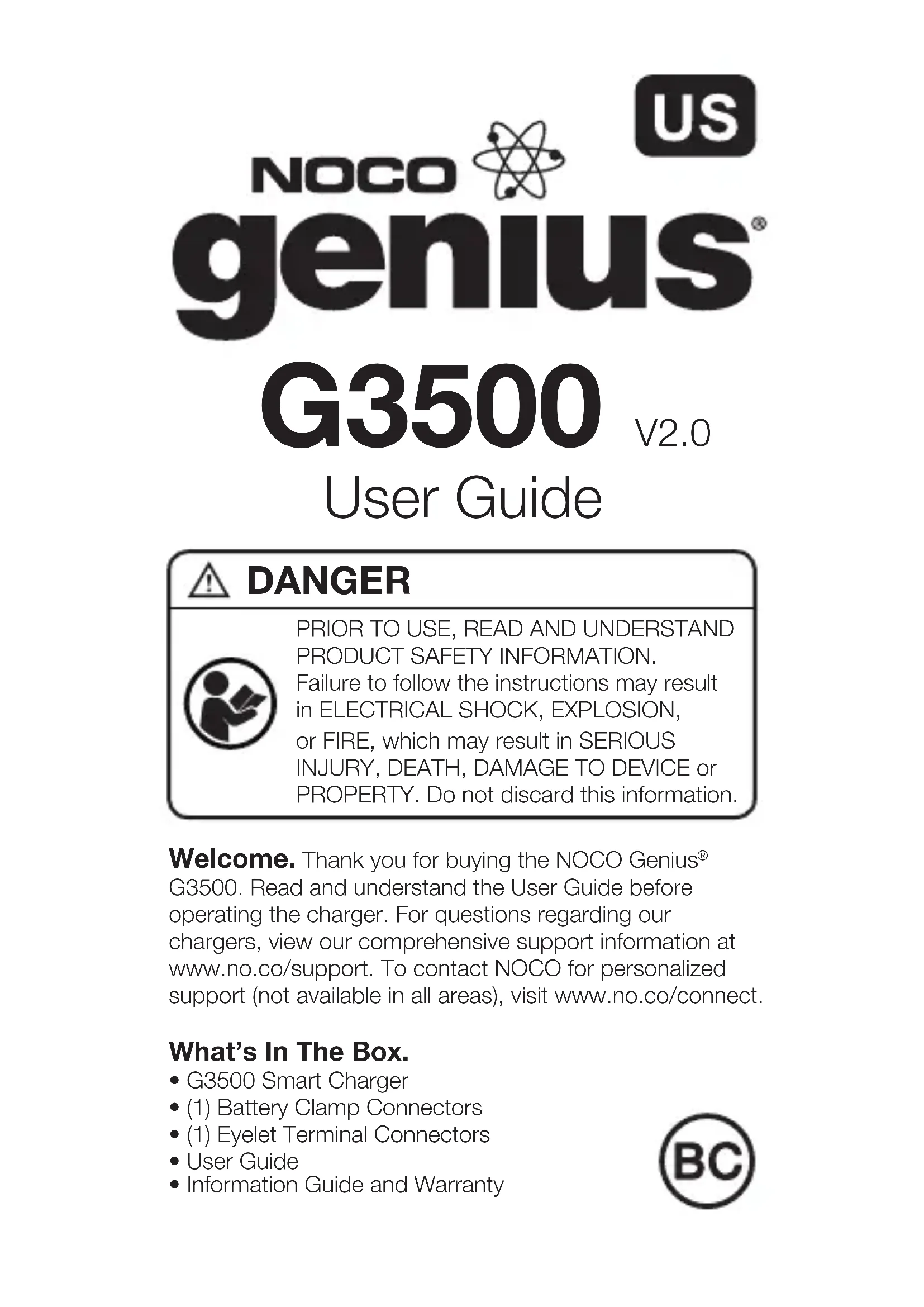 G3500. Read and understand the User Guide before operating the charger. For questions regarding our chargers, view our comprehensive support information at www.no.co/support. To contact NOCO for personalized support (not available in all areas), visit www.no.co/connect. What’s In The Box.