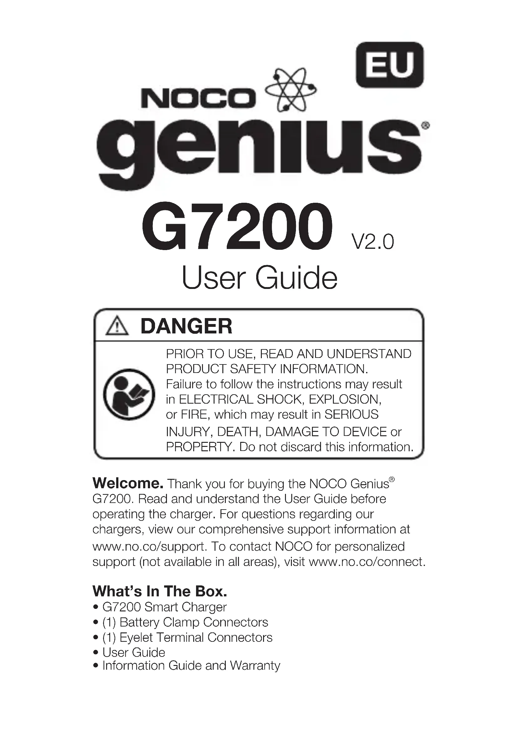 G7200. Read and understand the User Guide before operating the charger. For questions regarding our chargers, view our comprehensive support information at www.no.co/support. To contact NOCO for personalized support (not available in all areas), visit www.no.co/connect. What’s In The Box.