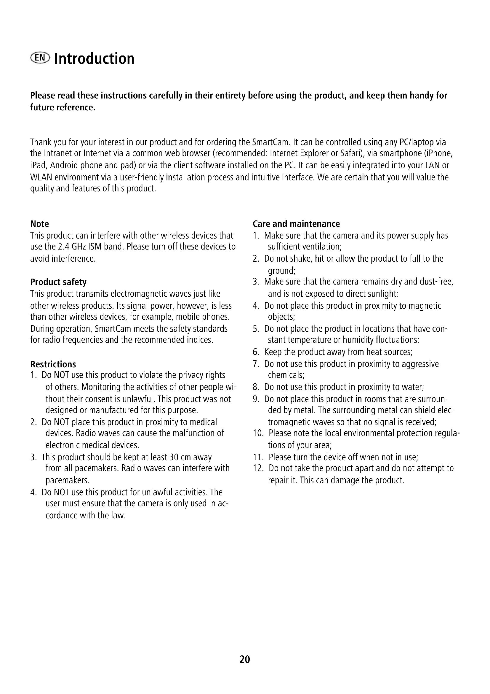 Thank you for your interest in our product and for ordering the SmartCam. It can be controlled using any PC/laptop via the Intranet or Internet via a common web browser (recommended: Internet Explorer or Safari), via smartphone (iPhone, iPad, Android phone and pad) or via the client software installed on the PC. It can be easily integrated into your LAN or WLAN environment via a user-friendly installation process and intuitive interface. We are certain that you will value the quality and features of this product.