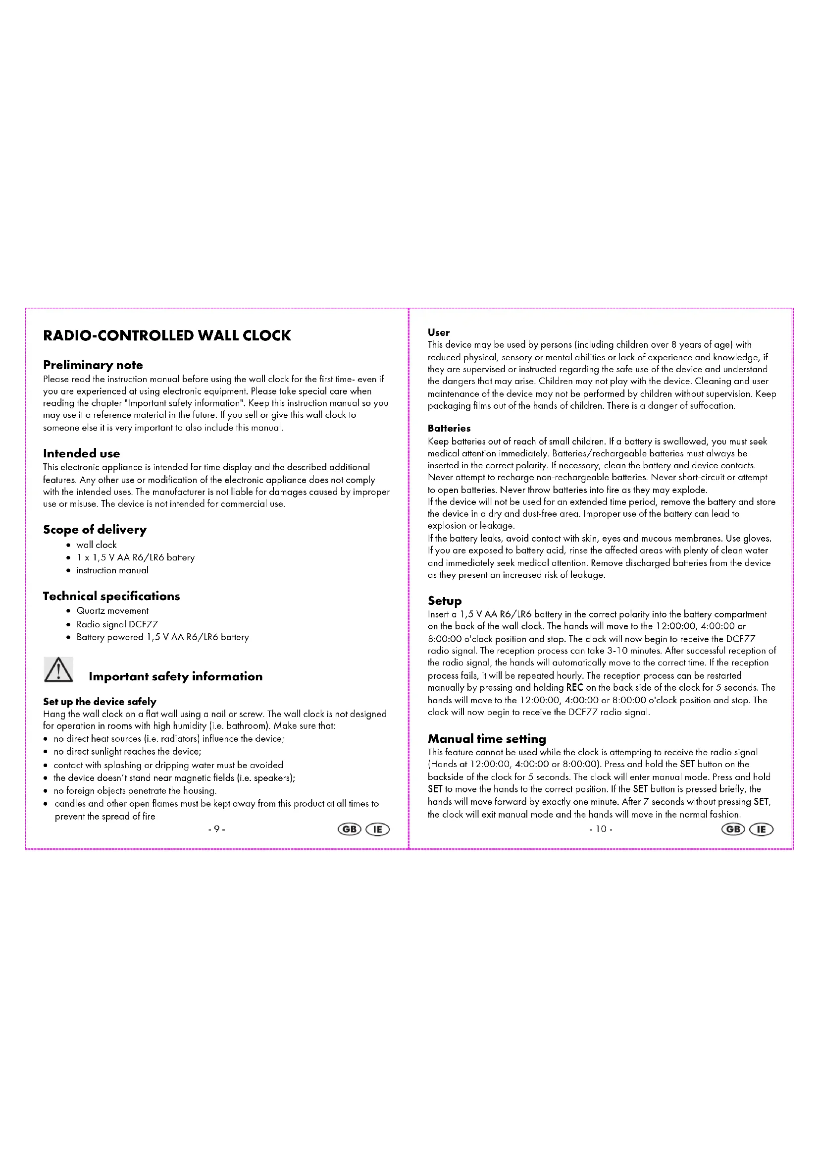 User This device may be used by persons (including children over 8 years of age) with reduced physical, sensory or mental abilities or lack of experience and knowledge, if they are supervised or instructed regarding the safe use of the device and understand the dangers that may arise. Children may not play with the device. Cleaning and user maintenance of the device may not be performed by children without supervision. Keep packaging films out of the hands of children. There is a danger of suffocation. Batteries Keep batteries out of reach of small children. If a battery is swallowed, you must seek medical attention immediately. Batteries/rechargeable batteries must always be inserted in the correct polarity. If necessary, clean the battery and device contacts. Never attempt to recharge non-rechargeable batteries. Never short-circuit or attempt to open batteries. Never throw batteries into fire as they may explode. If the device will not be used for an extended time period, remove the battery and store the device in a dry and dust-free area. Improper use of the battery can lead to explosion or leakage. If the battery leaks, avoid contact with skin, eyes and mucous membranes. Use gloves. If you are exposed to battery acid, rinse the affected areas with plenty of clean water and immediately seek medical attention. Remove discharged batteries from the device as they present an increased risk of leakage. Setup Insert a 1,5 V AA R6/LR6 battery in the correct polarity into the battery compartment on the back of the wall clock. The hands will move to the 12:00:00, 4:00:00 or 8:00:00 o'clock position and stop. The clock will now begin to receive the DCF77 radio signal. The reception process can take 3-10 minutes. After successful reception of the radio signal, the hands will automatically move to the correct time. If the reception process fails, it will be repeated hourly. The reception process can be restarted manually by pressing and holding REC on the back side of the clock for 5 seconds. The hands will move to the 12:00:00, 4:00:00 or 8:00:00 o'clock position and stop. The clock will now begin to receive the DCF77 radio signal. Manual time setting This feature cannot be used while the clock is attempting to receive the radio signal (Hands at 12:00:00, 4:00:00 or 8:00:00). Press and hold the SET button on the backside of the clock for 5 seconds. The clock will enter manual mode. Press and hold SET to move the hands to the correct position. If the SET button is pressed briefly, the hands will move forward by exactly one minute. After 7 seconds without pressing SET, the clock will exit manual mode and the hands will move in the normal fashion.-