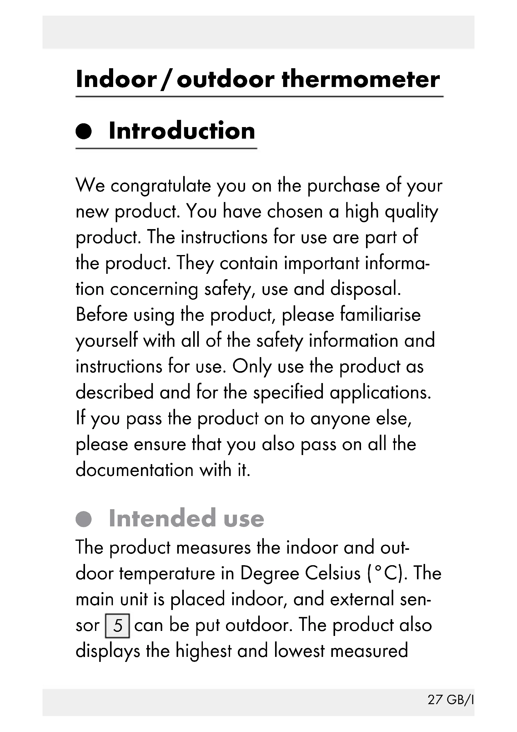 can be put outdoor. The product also displays the highest and lowest measured28 GB/IE temperature and the time in 24-hour format. The product is not intended for commercial use.