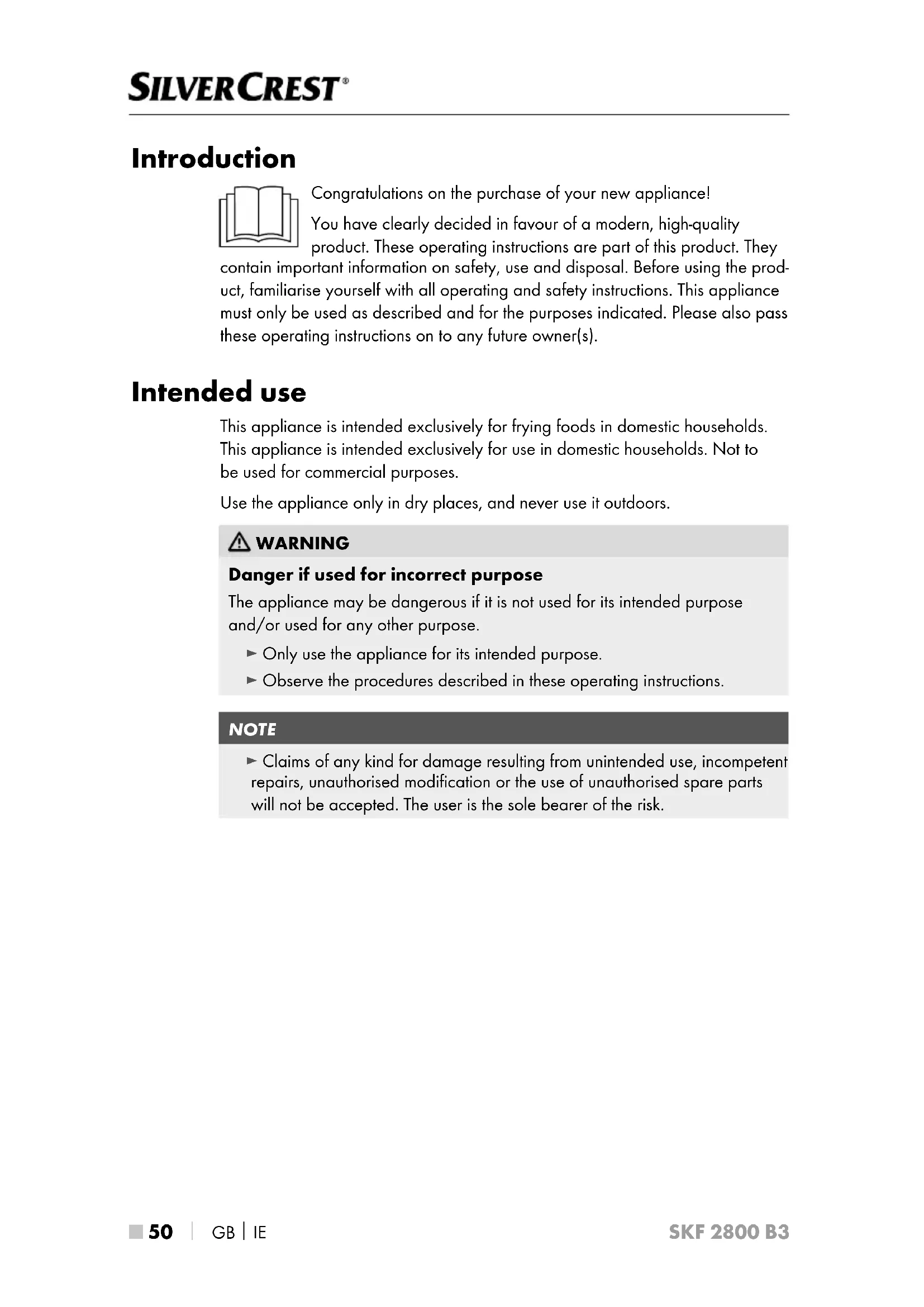 SKF 2800 B3 Introduction Congratulations on the purchase of your new appliance! You have clearly decided in favour of a modern, high-quality product. These operating instructions are part of this product. They contain important information on safety, use and disposal. Before using the prod- uct, familiarise yourself with all operating and safety instructions. This appliance must only be used as described and for the purposes indicated. Please also pass these operating instructions on to any future owner(s). Intended use This appliance is intended exclusively for frying foods in domestic households. This appliance is intended exclusively for use in domestic households. Not to be used for commercial purposes. Use the appliance only in dry places, and never use it outdoors. WARNING Danger if used for incorrect purpose The appliance may be dangerous if it is not used for its intended purpose and/or used for any other purpose. ► Only use the appliance for its intended purpose. ► Observe the procedures described in these operating instructions. NOTE ► Claims of any kind for damage resulting from unintended use, incompetent repairs, unauthorised modification or the use of unauthorised spare parts will not be accepted. The user is the sole bearer of the risk.GB