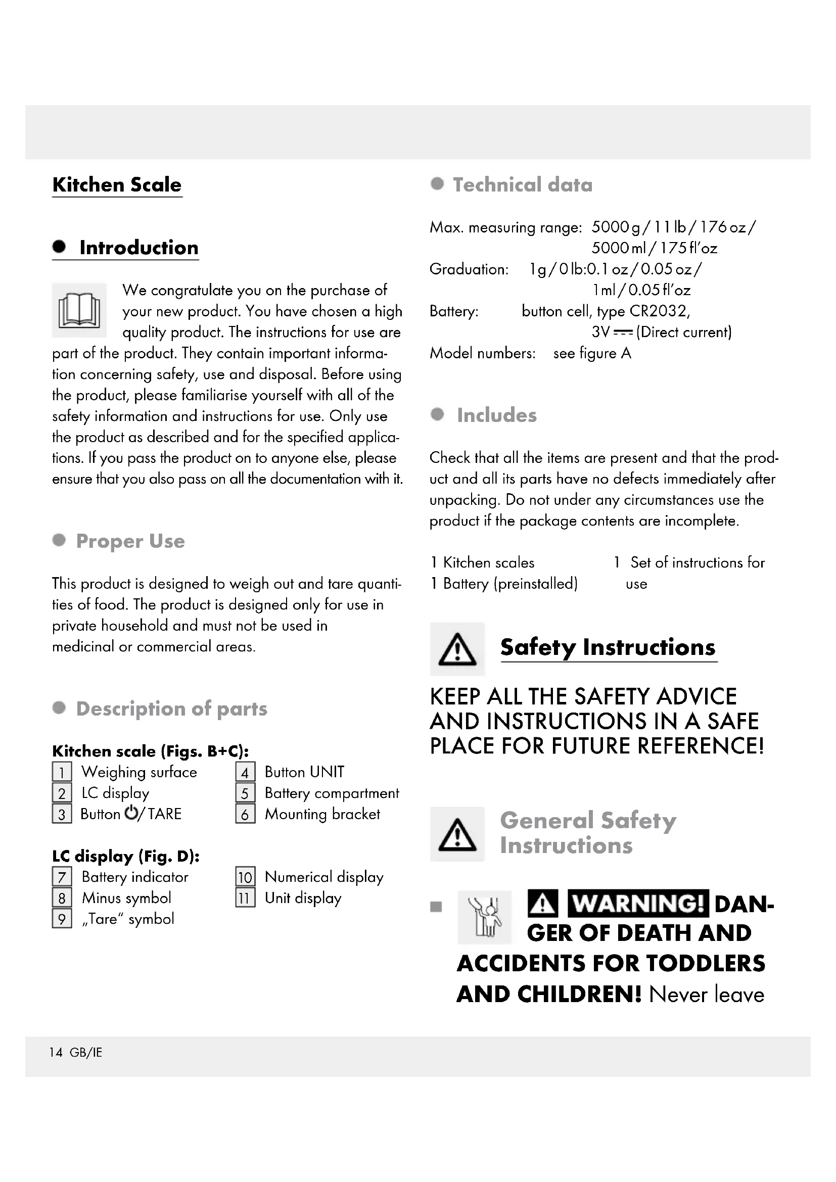 JURY! Do not place more than 5 kg on the product. This could damage the product. Do not expose the product to – extreme temperatures, – direct sunlight – magnetic fields, – moisture. These can damage the product. Protect the product from electro- static charge / discharge. This could hinder the internal data exchange, which causes errors in the LCD readout. Check the product for damage before use. Never use a damaged product. Magnetic fields may cause the product not to function properly. If this happens, briefly remove the batteries from the product and re-insert them. FOOD-SAFE! The taste and smell of your food are not detrimentally affected by this product. Safety instructions for batteries /rechargeable batteries DANGER TO LIFE! Keep batter- ies / rechargeable batteries out of reach of children. If accidentally swallowed seek immediate medi- cal attention.16 GB/IE
