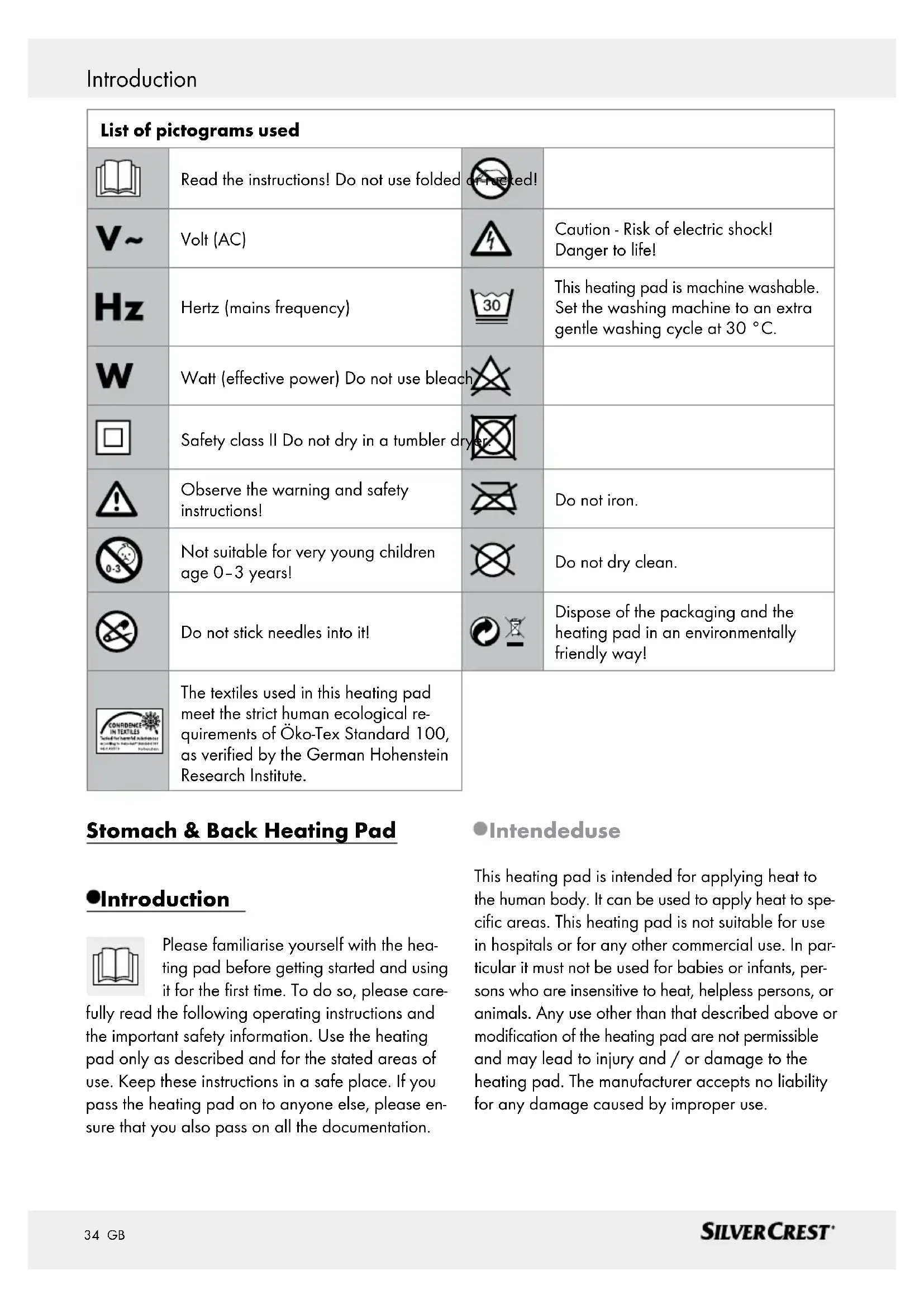 Set the washing machine to an extra gentle washing cycle at 30 °C. Watt (effective power) Do not use bleach. Safety class II Do not dry in a tumbler dryer. Observe the warning and safety instructions! Do not iron. Not suitable for very young children age 0–3 years! Do not dry clean. Do not stick needles into it! Dispose of the packaging and the heating pad in an environmentally friendly way! The textiles used in this heating pad meet the strict human ecological re- quirements of Öko-Tex Standard 100, as verified by the German Hohenstein Research Institute.35 GB Introduction / Important safety instructions Parts description