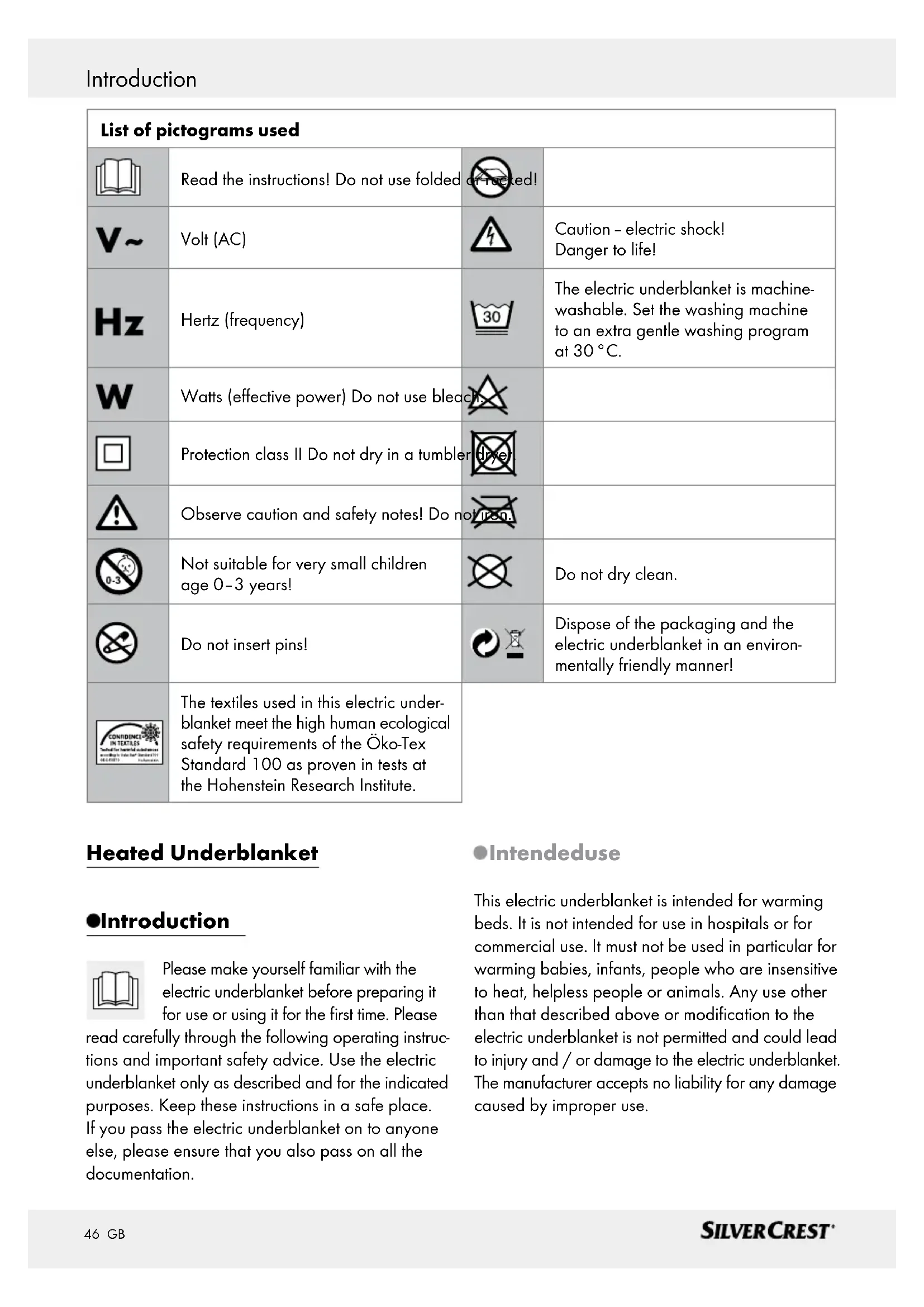 Plug-in connector Included items Check that all the items are present and that the electric underblanket is in perfect condition immedi- ately after unpacking. 1 Heated underblanket 1 Control unit / Plug-in connector 1 Operating instructions Technical data Model: SWUB 85 B2 Type: W1 Power supply: 220–230 V / 50–60 Hz Power consumption: 60 W Dimensions: Approx. 150 x 80 cm Protection class: II / Electrical field strength: max. 5000 V / m Magnetic field strength: max. 80 A / m Magnetic flux density: max. 0.1 millitesla. Manufacturer: MGG Elektro GmbH Steinstraße 27 40210 Düsseldorf, Germany IMPORTANT INFORMATION – RETAIN FOR FUTURE USE! Important safety instructions Failure to ob- serve the following instructions can cause personal injury or property damage (electric shock, burns, fire). The following advice on safety and hazards is intended to protect your health and that of other people as well as to protect the electric underblanket. Observe this safety advice. If you pass the electric underblanket on to anyone else, please pass on these opera- tion instructions as well. SCALDING HAZARD! This electric underblanket may not be used by persons in- sensitive to heat and other per- sons in need of protection who do not respond to overheating (e.g. diabetics, persons with skin changes caused by illness or scarred skin areas in the appli- cation area after using analge- sics or alcohol). There is a risk of receiving skin burns. This electric underblanket48 GB Important safety instructions may not be used for very young children (0–3 years), as they are unable to react to overheat- ing. There is a risk of receiving skin burns. This electric underblanket may not be used by young children (3–8 years) unless the control unit was set by a parent or a supervising person and the child was adequately instructed on the safe use of the electric un- derblanket. There otherwise is a risk of burns. This electric underblanket may be used by older children age 8 and up, and persons with di- minished physical, sensory or mental capacities or lacking ex- perience and knowledge when supervised and instructed on the safe use of the electric under- blanket and they understand the associated risks. Children must be supervised so they do not play with the electric underblanket. There is a risk of injury. Children must not perform clean or maintain the product without supervision. There is a risk of injury. This electric underblanket is not intended for hospital or commercial use. This poses a risk of injuries and/or damage to the electric underblanket.