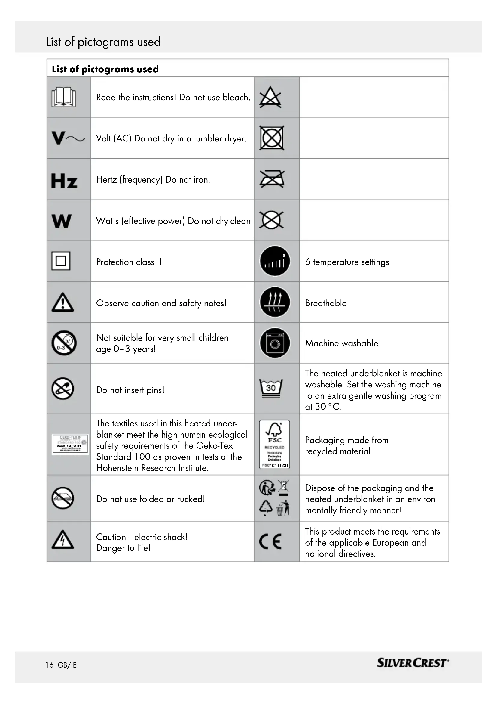 | Do not use folded or rucked! | Dispose of the packaging and the heated underblanket in an environ-mentally friendly manner! | ||