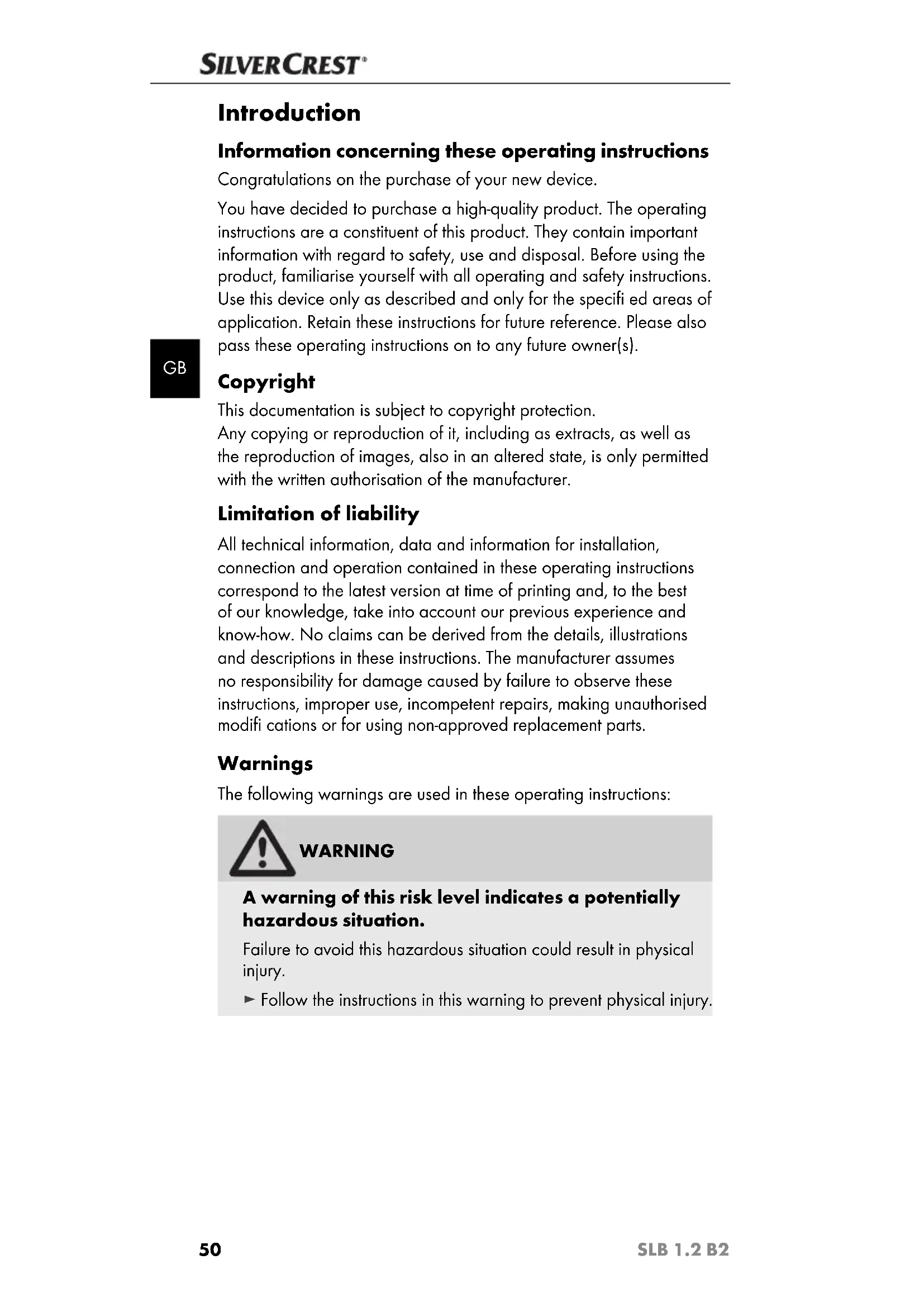 SLB 1.2 B2 Introduction Information concerning these operating instructions Congratulations on the purchase of your new device. You have decided to purchase a high-quality product. The operating instructions are a constituent of this product. They contain important information with regard to safety, use and disposal. Before using the product, familiarise yourself with all operating and safety instructions. Use this device only as described and only for the specifi ed areas of application. Retain these instructions for future reference. Please also pass these operating instructions on to any future owner(s). Copyright This documentation is subject to copyright protection. Any copying or reproduction of it, including as extracts, as well as the reproduction of images, also in an altered state, is only permitted with the written authorisation of the manufacturer. Limitation of liability All technical information, data and information for installation, connection and operation contained in these operating instructions correspond to the latest version at time of printing and, to the best of our knowledge, take into account our previous experience and know-how. No claims can be derived from the details, illustrations and descriptions in these instructions. The manufacturer assumes no responsibility for damage caused by failure to observe these instructions, improper use, incompetent repairs, making unauthorised modifi cations or for using non-approved replacement parts. Warnings The following warnings are used in these operating instructions: WARNING A warning of this risk level indicates a potentially hazardous situation. Failure to avoid this hazardous situation could result in physical injury. ► Follow the instructions in this warning to prevent physical injury. IB_89655_SLB1.2B2_LB1.indb 50IB_89655_SLB1.2B2_LB1.indb 50 16.05.13 11:0216.05.13 11:0251 SLB 1.2 B2