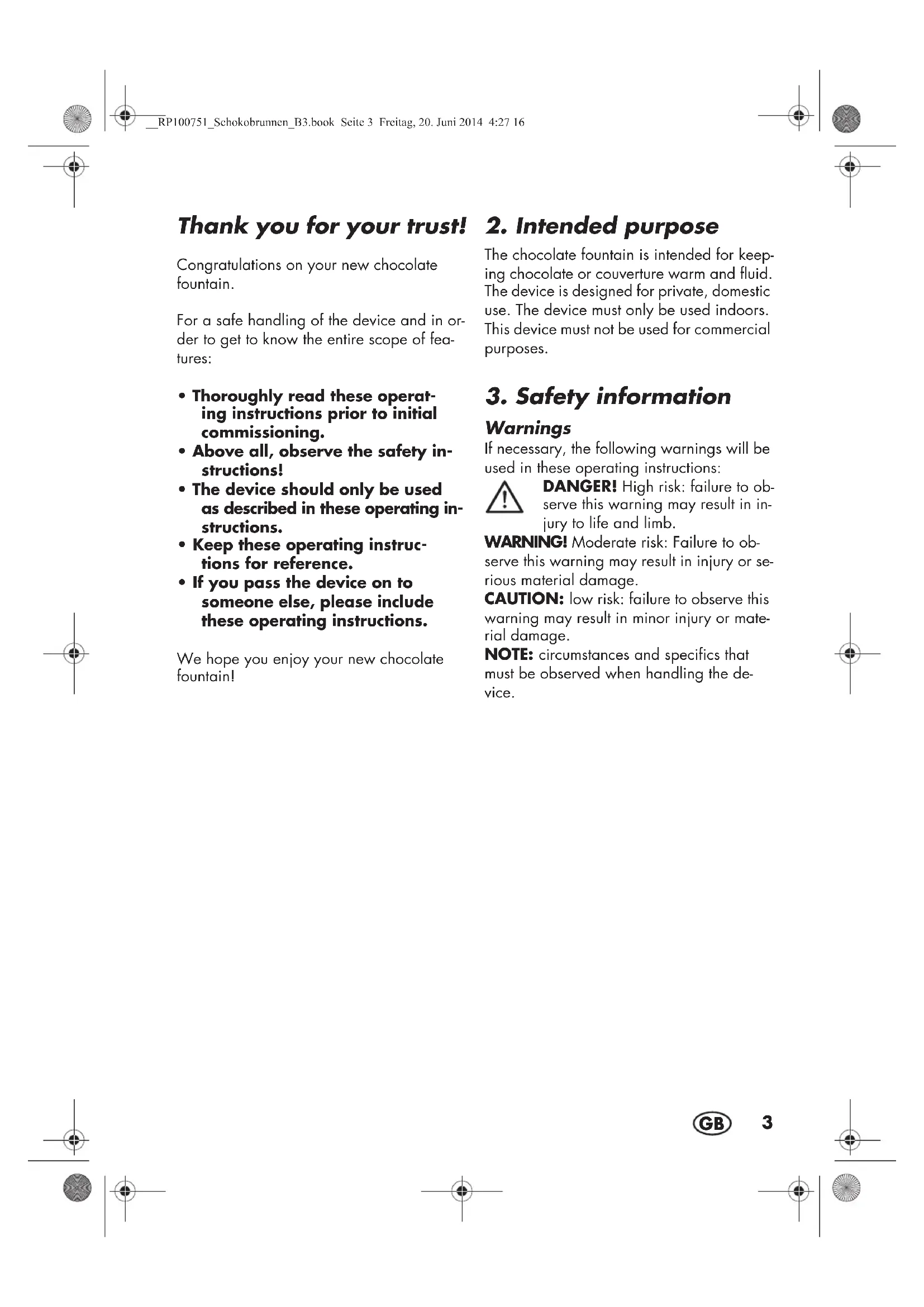 The chocolate fountain is intended for keeping chocolate or couverture warm and fluid. The device is designed for private, domestic use. The device must only be used indoors. This device must not be used for commercial purposes.