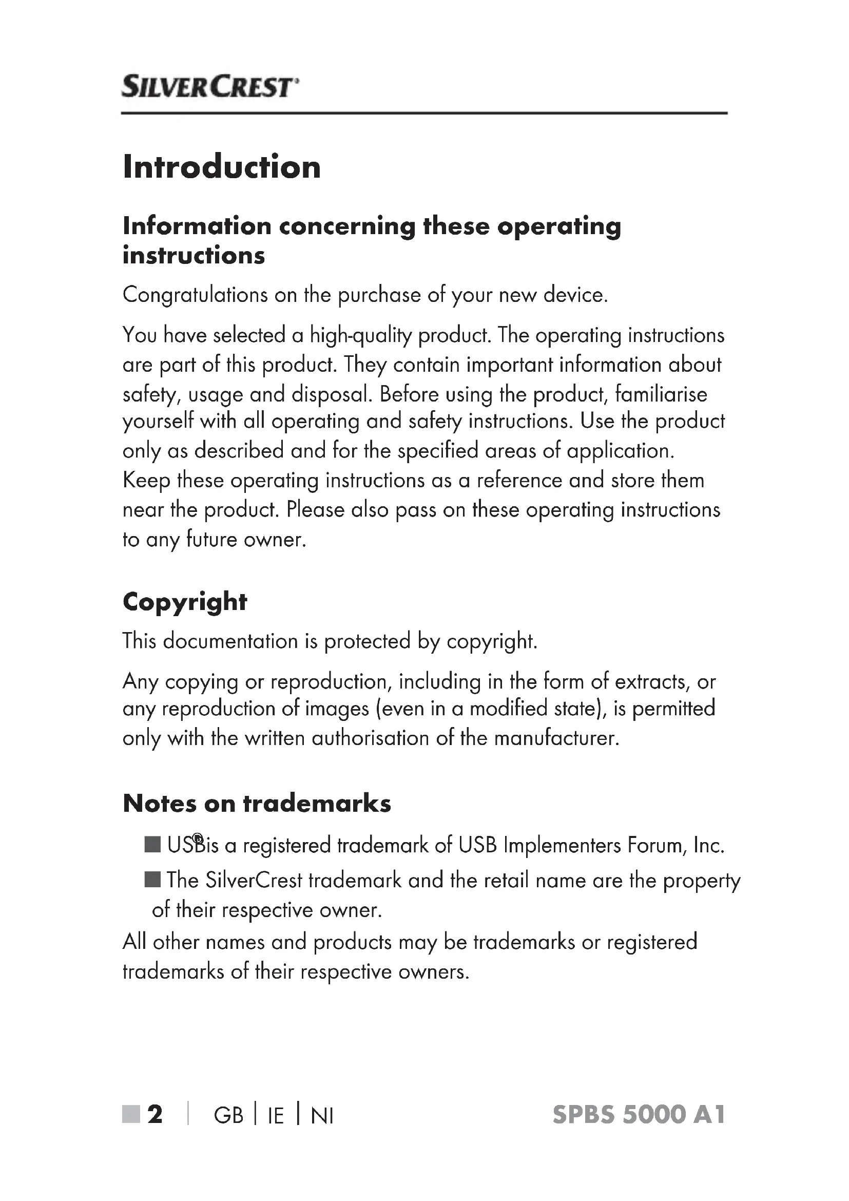 SPBS 5000 A1 Introduction Information concerning these operating instructions Congratulations on the purchase of your new device. You have selected a high-quality product. The operating instructions are part of this product. They contain important information about safety, usage and disposal. Before using the product, familiarise yourself with all operating and safety instructions. Use the product only as described and for the specified areas of application. Keep these operating instructions as a reference and store them near the product. Please also pass on these operating instructions to any future owner. Copyright This documentation is protected by copyright. Any copying or reproduction, including in the form of extracts, or any reproduction of images (even in a modified state), is permitted only with the written authorisation of the manufacturer. Notes on trademarks ■ USB