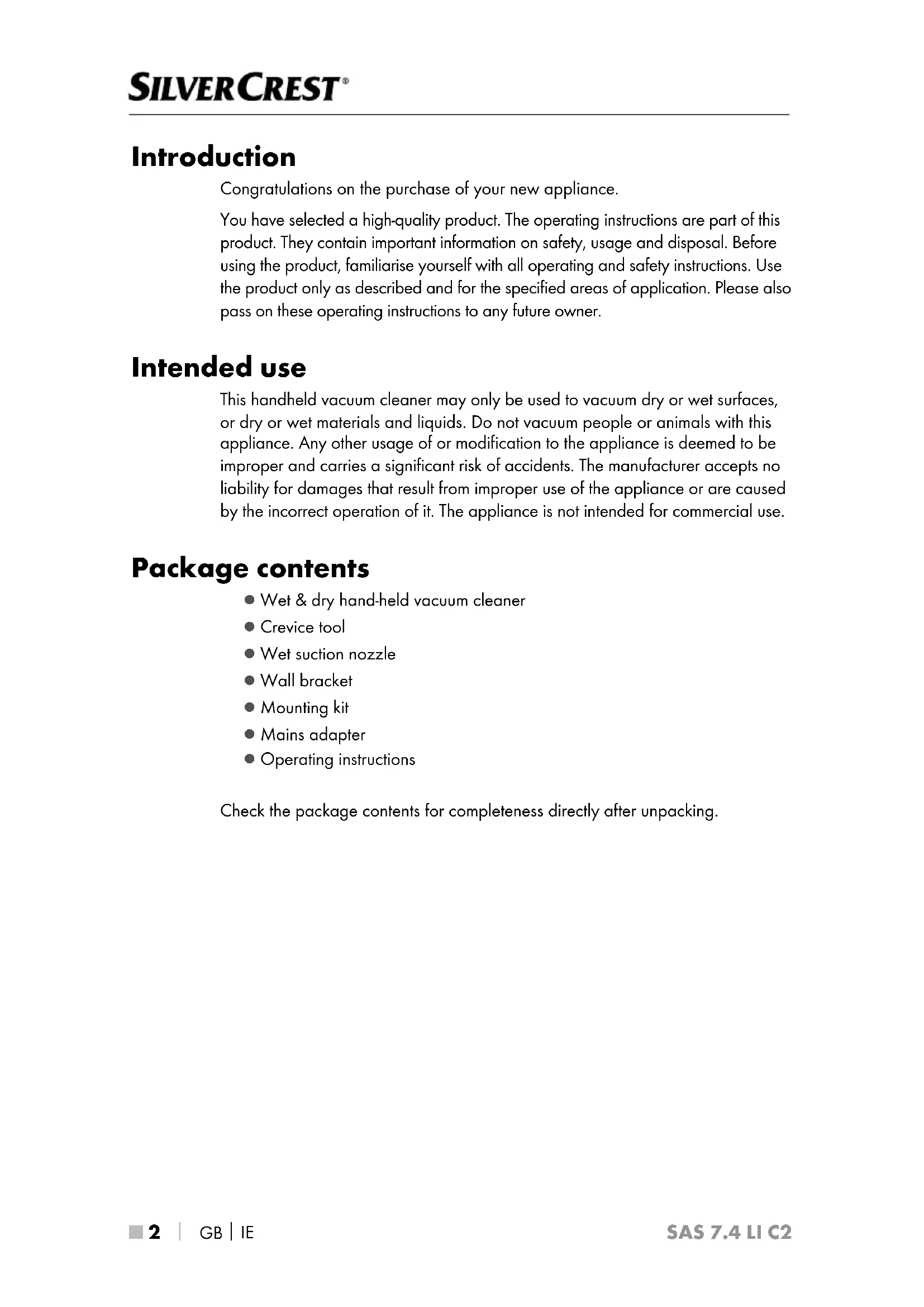 Introduction Congratulations on the purchase of your new appliance. You have selected a high-quality product. The operating instructions are part of this product. They contain important information on safety, usage and disposal. Before using the product, familiarise yourself with all operating and safety instructions. Use the product only as described and for the specified areas of application. Please also pass on these operating instructions to any future owner. Intended use This handheld vacuum cleaner may only be used to vacuum dry or wet surfaces, or dry or wet materials and liquids. Do not vacuum people or animals with this appliance. Any other usage of or modification to the appliance is deemed to be improper and carries a significant risk of accidents. The manufacturer accepts no liability for damages that result from improper use of the appliance or are caused by the incorrect operation of it. The appliance is not intended for commercial use. Package contents ▯ Wet & dry hand-held vacuum cleaner ▯ Crevice tool ▯ Wet suction nozzle ▯ Wall bracket ▯ Mounting kit ▯ Mains adapter ▯ Operating instructions Check the package contents for completeness directly after unpacking.GB