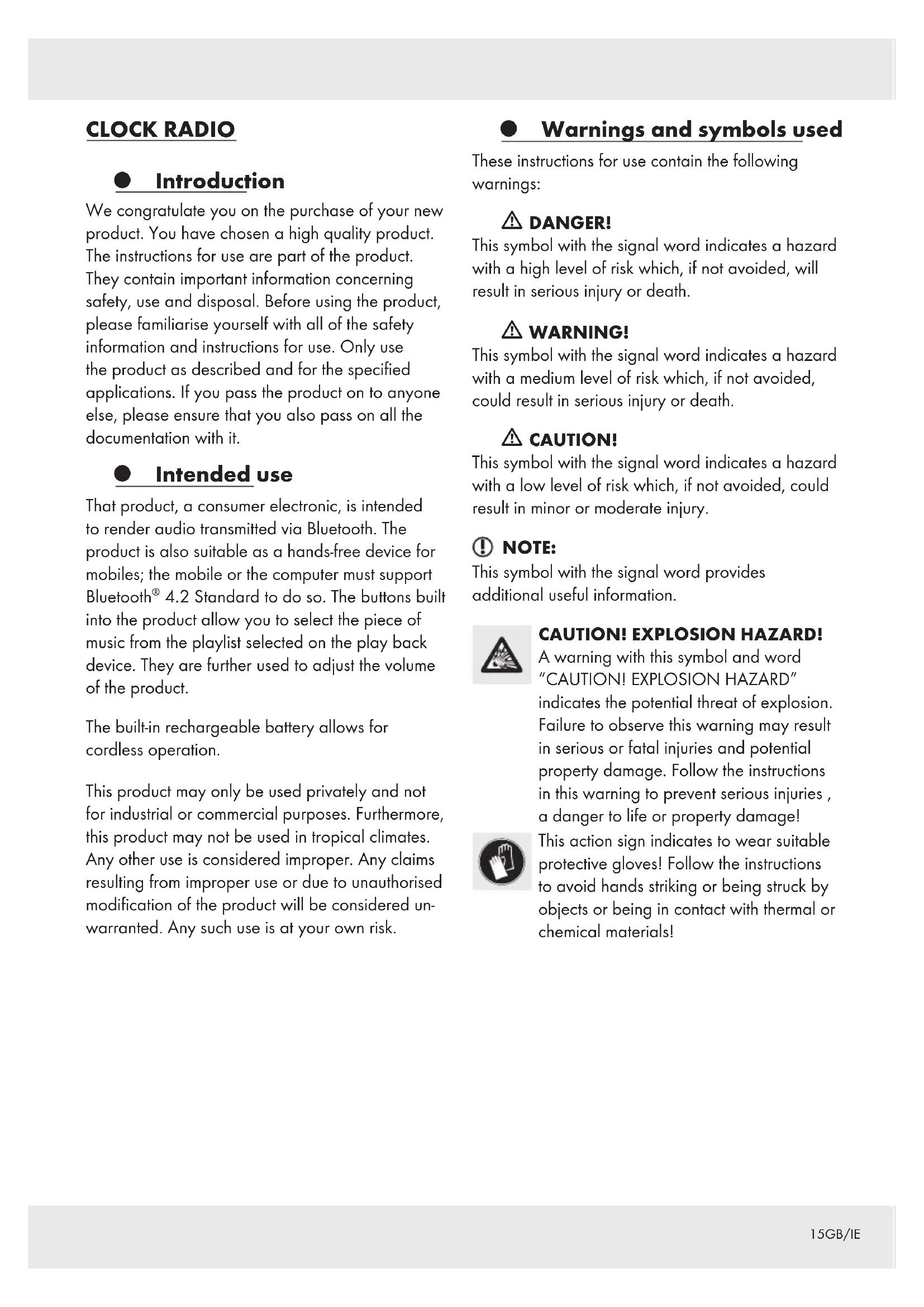 We congratulate you on the purchase of your new product. You have chosen a high quality product. The instructions for use are part of the product. They contain important information concerning safety, use and disposal. Before using the product, please familiarise yourself with all of the safety information and instructions for use. Only use the product as described and for the specified applications. If you pass the product on to anyone else, please ensure that you also pass on all the documentation with it.