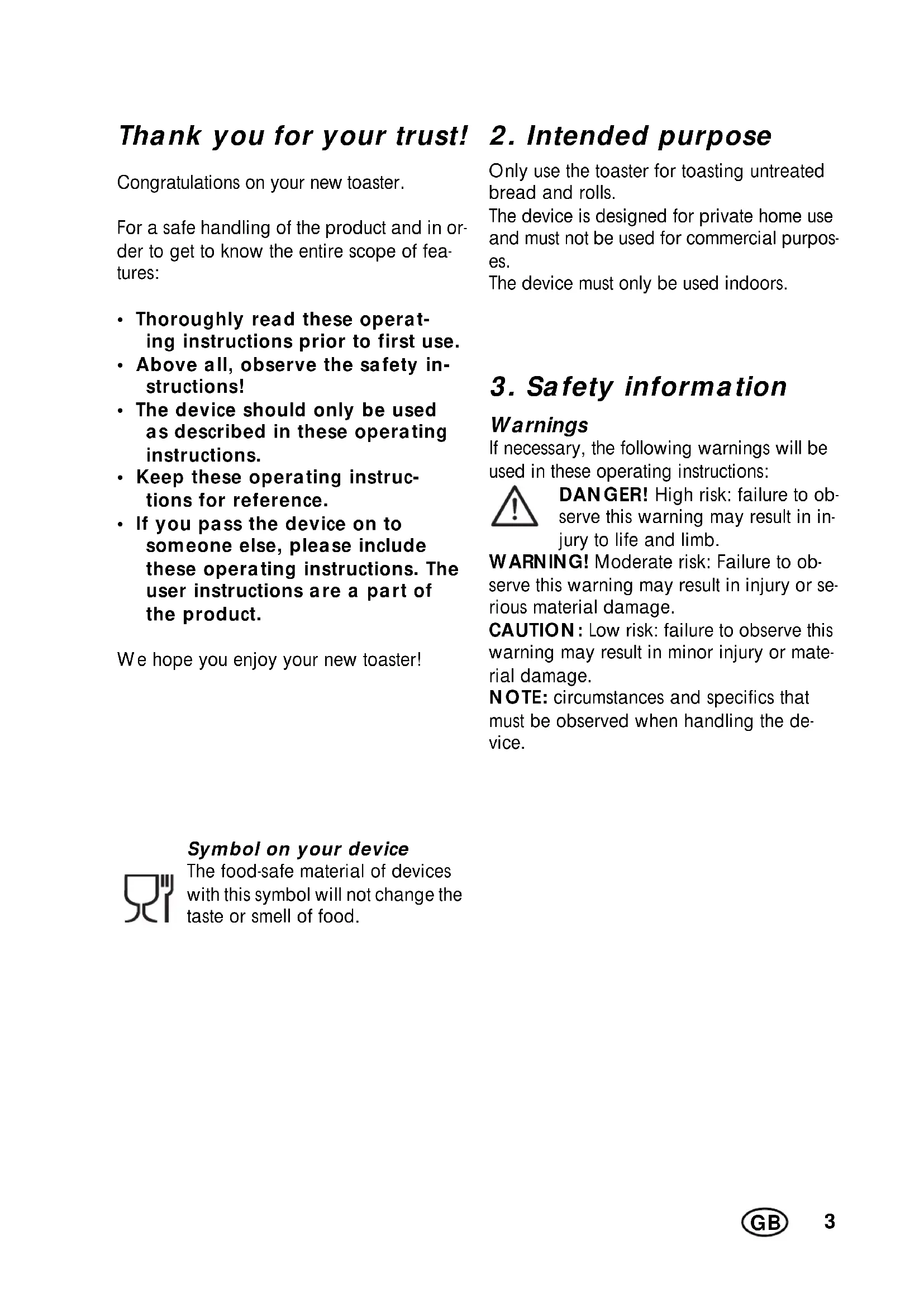 - If you pass the device on to someone else, please include these operating instructions. The user instructions are a part of the product. We hope you enjoy your new toaster! Symbol on your device The food-safe material of devices with this symbol will not change the taste or smell of food.