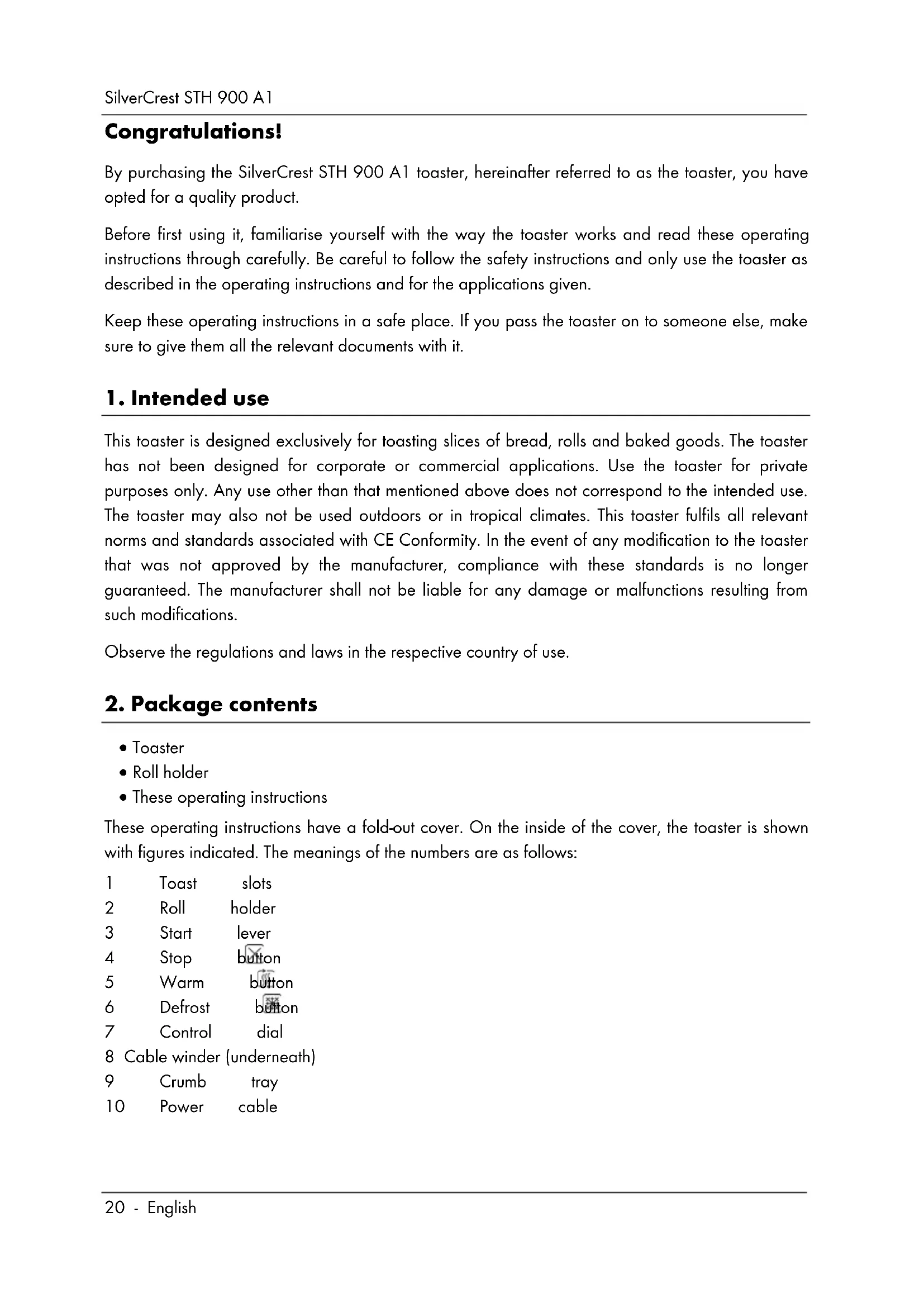 - These operating instructions These operating instructions have a fold-out cover. On the inside of the cover, the toaster is shown with figures indicated. The meanings of the numbers are as follows: 1 Toast slots 2 Roll holder 3 Start lever 4 Stop button 5 Warm button 6 Defrost button 7 Control dial 8 Cable winder (underneath) 9 Crumb tray 10 Power cableSilverCrest STH 900 A1 English - 21