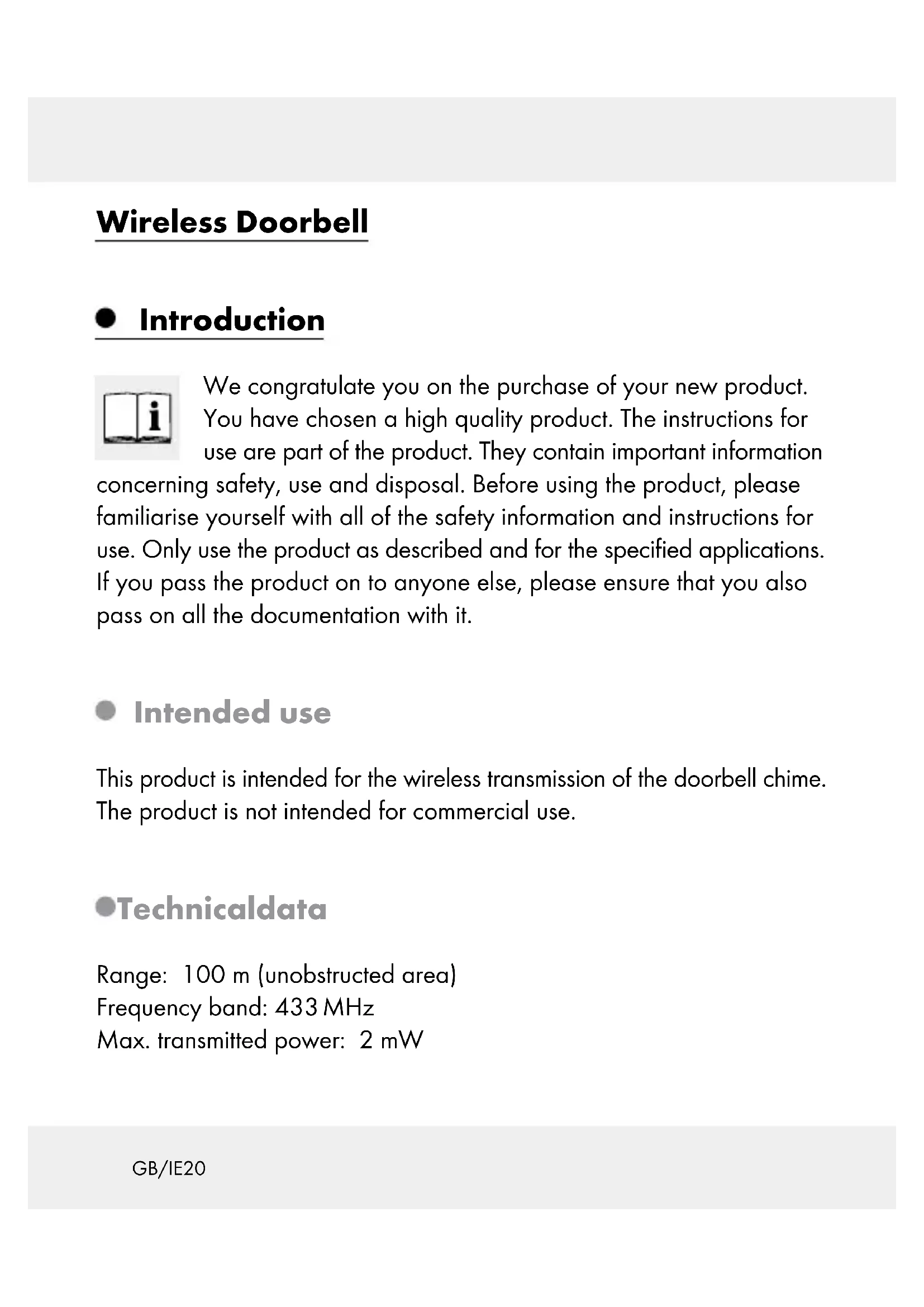 OF ACCIDENTS FOR TODDLERS AND CHILDREN! Never leave children alone and unsupervised with the packaging material. There is a risk of suffocation from the packaging material. Children often underestimate risks. Always keep children away from the product. This is not a toy. This product can be used by children aged from 8 years and above and persons with reduced physical, sensory or mental capabilities or lack of experience and knowledge if they have been given super- vision or instruction concerning use of the product in a safe way and understand the hazards involved. Children shall not play with the product. Cleaning and user maintenance shall not be made by children without supervision.GB/IE24 Check that all parts are in sound condition. If you use damaged parts when assembling the product, you risk injury. Check that all parts have been assembled correctly. There is a risk of injury if the product is not properly assembled. Keep the product away from open flames or sources of heat (e.g. burning candles). Safety instructions for batteries / rechargeable batteries KEEP BATTERIES OUT OF THE REACH OF CHILDREN! Swallowing may cause chemical burns, perforations of soft tissue and death. Severe burns may occur 2 hours after swallowing. Seek immediate medical attention. DANGER TO LIFE! Keep batteries / rechargeable batteries out of reach of children. If accidentally swallowed seek immediate medical attention. DANGER OF EXPLOSION! Never recharge non-re- chargeable batteries. Do not short-circuit batteries / re- chargeable batteries and / or open them. Overheating, fire or bursting can be the result. Never throw batteries / rechargeable batteries into fire or water. Do not exert mechanical loads to batteries / rechargeable batteries.GB/IE 25 Risk of leakage of batteries / rechargeable batteries Avoid extreme environmental conditions and temperatures, which could affect batteries / rechargeable batteries, e.g. radiators / direct sunlight. Avoid contact with the skin, eyes and mucous membranes. In the event of contact with battery acid, thoroughly flush the affected area with plenty of clean water and seek immediate medical attention. WEAR PROTECTIVE GLOVES! Leaked or damaged batteries / rechargeable batteries can cause burns on contact with the skin. Wear suitable protective gloves at all times if such an event occurs. In the event of a leakage of batteries / rechargeable batteries, immediately remove them from the product to prevent damage. Only use the same type of batteries / rechargeable batteries. Do not mix used and new batteries / rechargeable batteries. Remove the batteries / rechargeable batteries if the product will not be used for a longer period. Risk of damage of the product Only use the specified type of battery / rechargeable battery! Insert batteries / rechargeable batteries according to polarity marks (+) and (-) on the battery / rechargeable battery and the product. Clean the contacts on the battery / rechargeable battery and in the battery compartment before inserting! Remove exhausted batteries / rechargeable batteries from the product immediately.GB/IE26 Assembly Note: Remove all packaging materials from the product. Note: You will need a screwdriver and a drill to assemble the doorbell. Note: Only use the screws and dowels supplied for the assembly of the product. Mount the receiver (see Fig. E) Mount the transmitter (see Fig. F) Preparing for use Inserting / replacing the batteries Insert the batteries to provide power to the product before preparing it for use. CAUTION! Use the above-indicated battery types only. Failure to observe this advice may result in damage to the product. Receiver: Remove the battery compartment cover