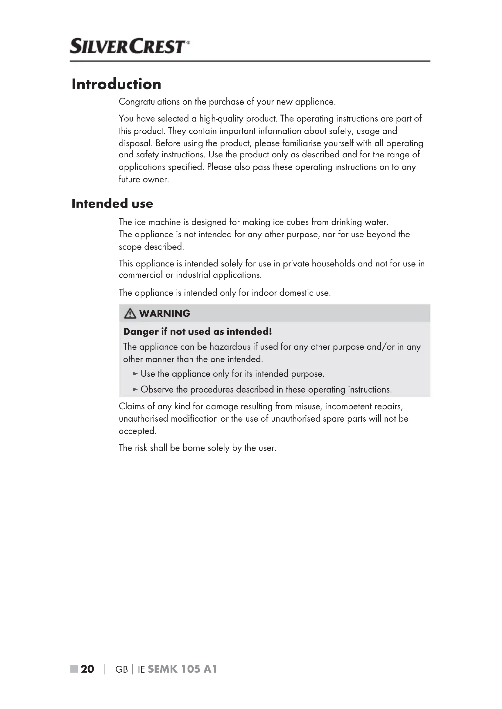 Introduction Congratulations on the purchase of your new appliance. You have selected a high-quality product. The operating instructions are part of this product. They contain important information about safety, usage and disposal. Before using the product, please familiarise yourself with all operating and safety instructions. Use the product only as described and for the range of applications specified. Please also pass these operating instructions on to any future owner. Intended use The ice machine is designed for making ice cubes from drinking water. The appliance is not intended for any other purpose, nor for use beyond the scope described. This appliance is intended solely for use in private households and not for use in commercial or industrial applications. The appliance is intended only for indoor domestic use. WARNING Danger if not used as intended! The appliance can be hazardous if used for any other purpose and/or in any other manner than the one intended. ► Use the appliance only for its intended purpose. ► Observe the procedures described in these operating instructions. Claims of any kind for damage resulting from misuse, incompetent repairs, unauthorised modification or the use of unauthorised spare parts will not be accepted. The risk shall be borne solely by the user.GB