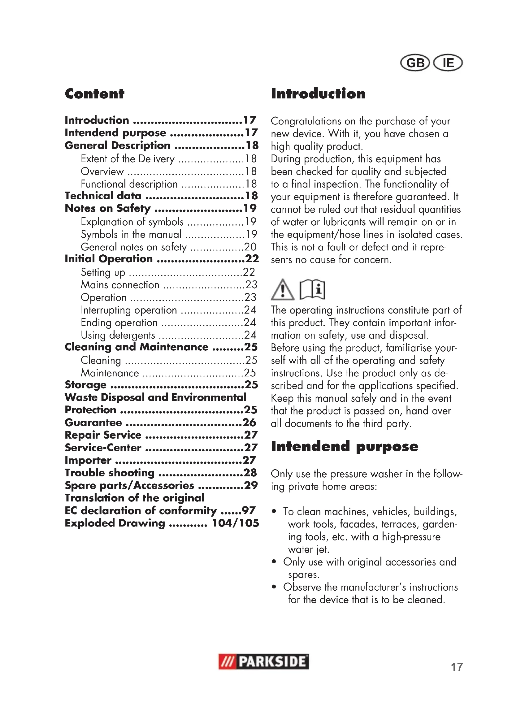 The pressure washer is to be used for washing with a high-pressure water jet. A detergent can be added if this is required. For the functions of the operating elements please refer to the subsequent description. Ensure that the safety instructions are always observed!