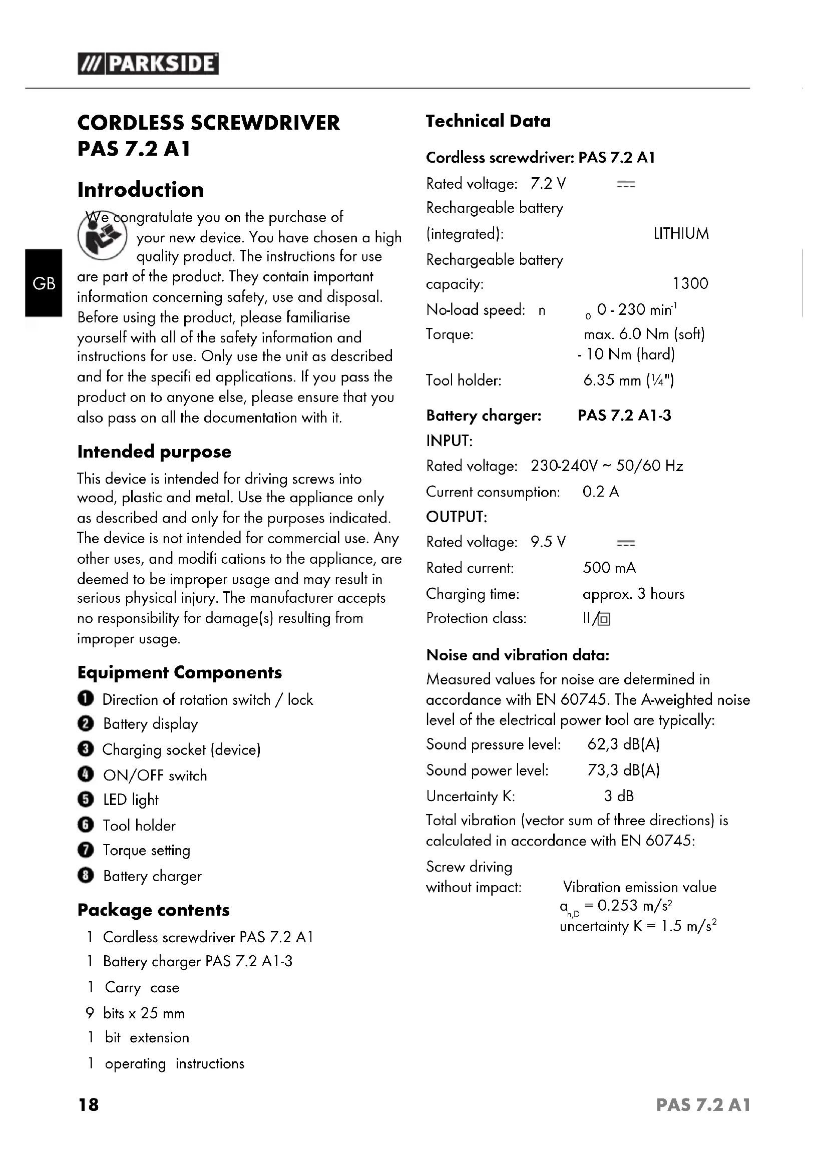 USER MANUAL PAS 7.2 A1 PARKSIDE
